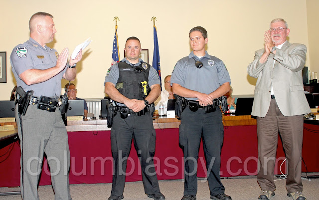 Columbia Police Chief Jack Brommer introduced two new Columbia Borough police officers at Monday’s borough council meeting. Pictured above, they are Justin Barrell (left) and Andrew Snyder. They are flanked by Brommer and Mayor Leo Lutz.