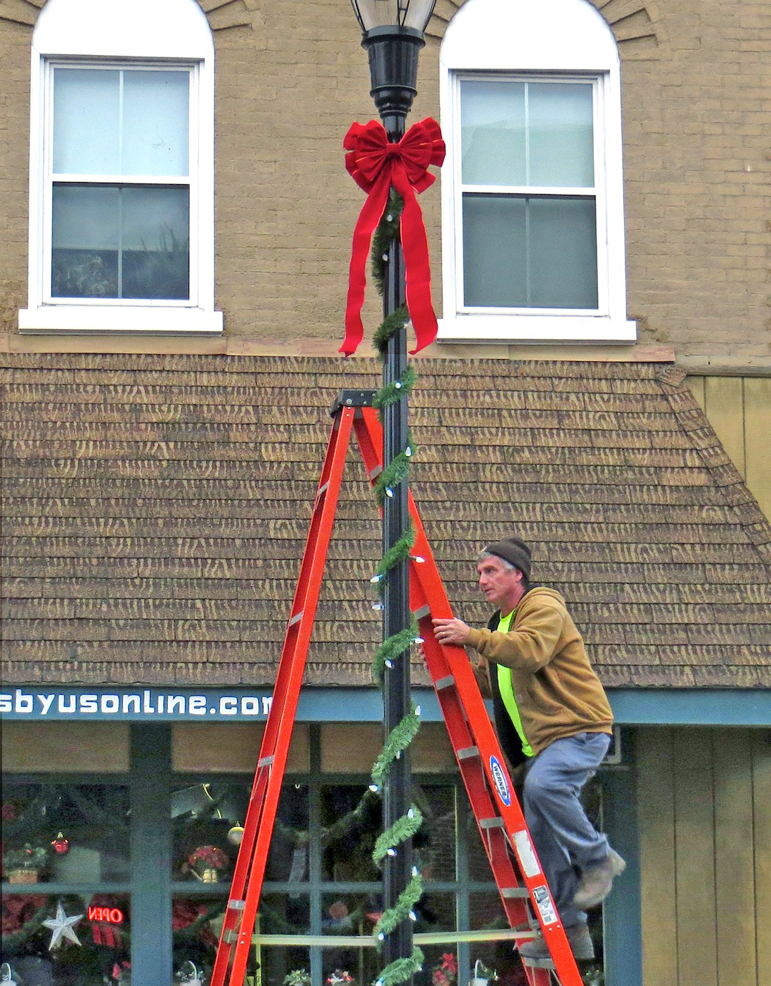 'Tis the Season A worker finishes decorating a lamp post. Three blocks of posts along Locust Street are now draped with lights and topped off with ribbons. Share this: Share on X (Opens in new window) X Share on Facebook (Opens in new window) Facebook More Share on Bluesky (Opens in new window) Bluesky Share on X (Opens in new window) X Like Loading... Related
