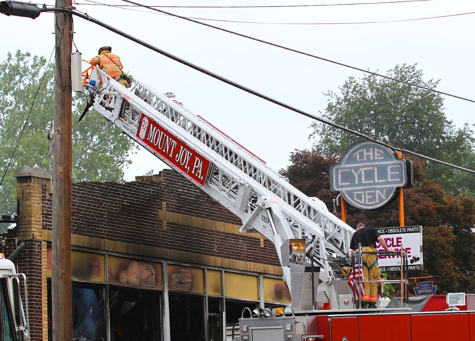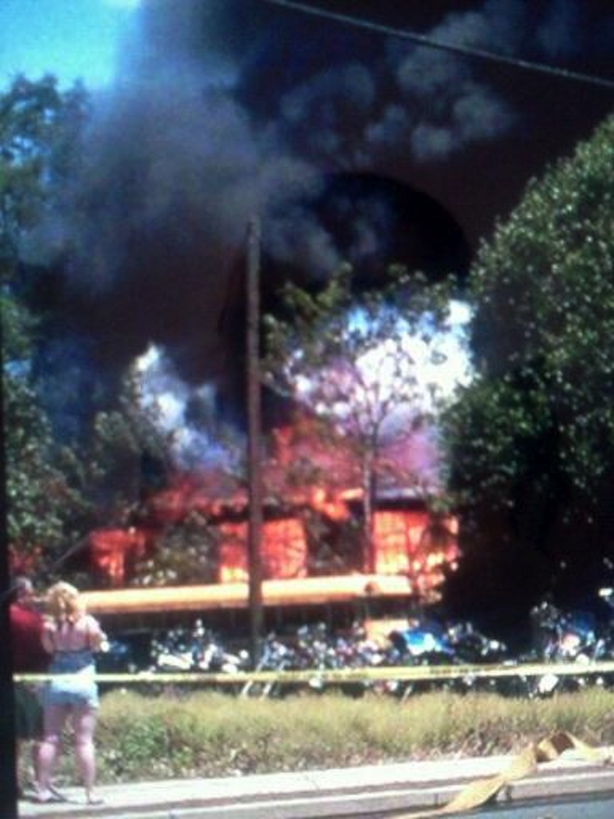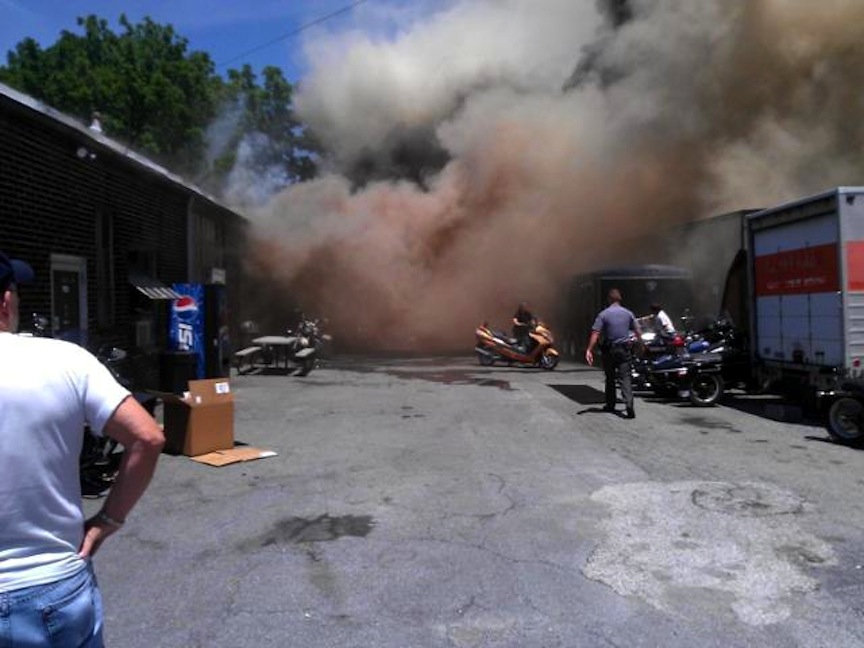 Shortly after 1 p.m. today, The Cycle Den caught fire when gas that had leaked from a motorcycle in for repair ignited. Many of the motorcycles – some vintage – were saved, but some sustained fire damage. By sunset, the building had been demolished by work crews, as fire personnel sprayed water on the wreckage to put out any remaining hot spots.