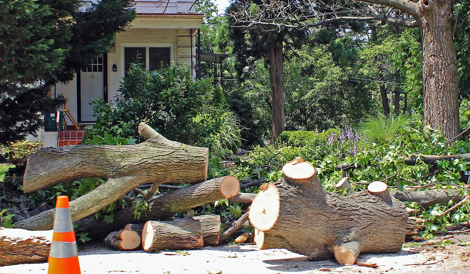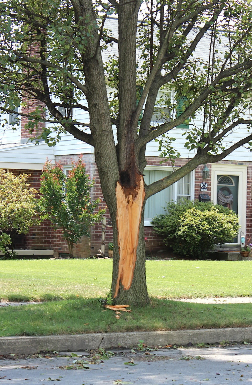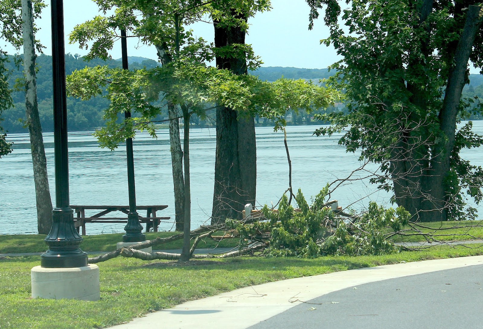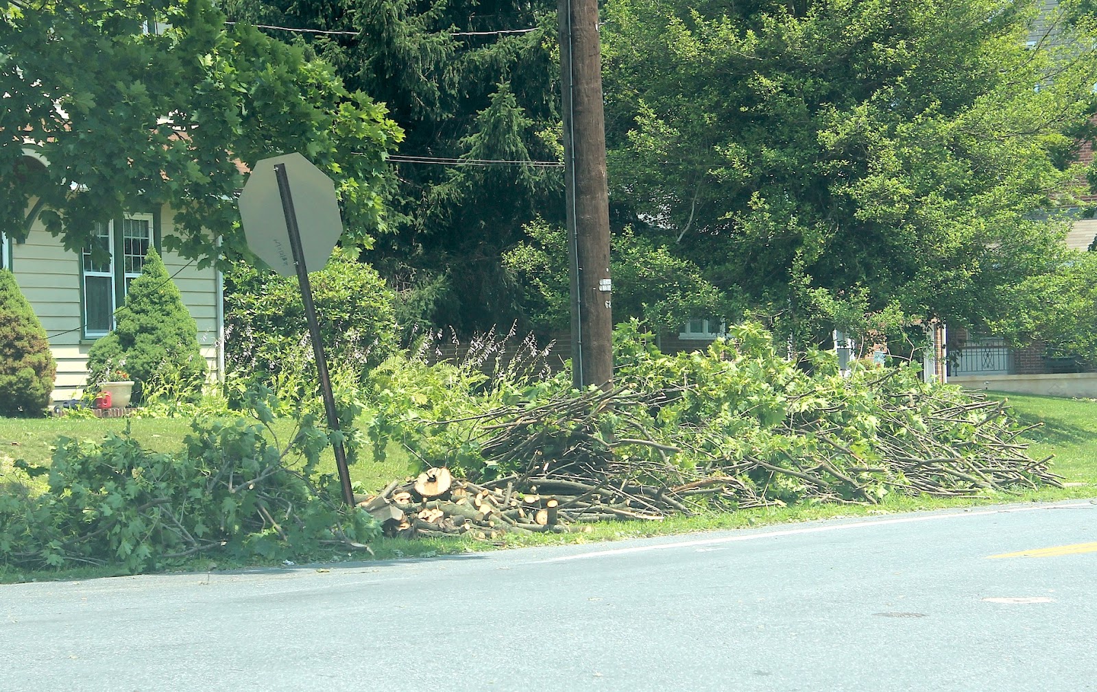 Last night’s nasty storm brought with it high winds that knocked over trees, broke off limbs, downed power lines, and caused power outages. The worst hit area seemed to be the swath between Route 462 and the river. Earlier today, I shot the following pics of the aftermath.