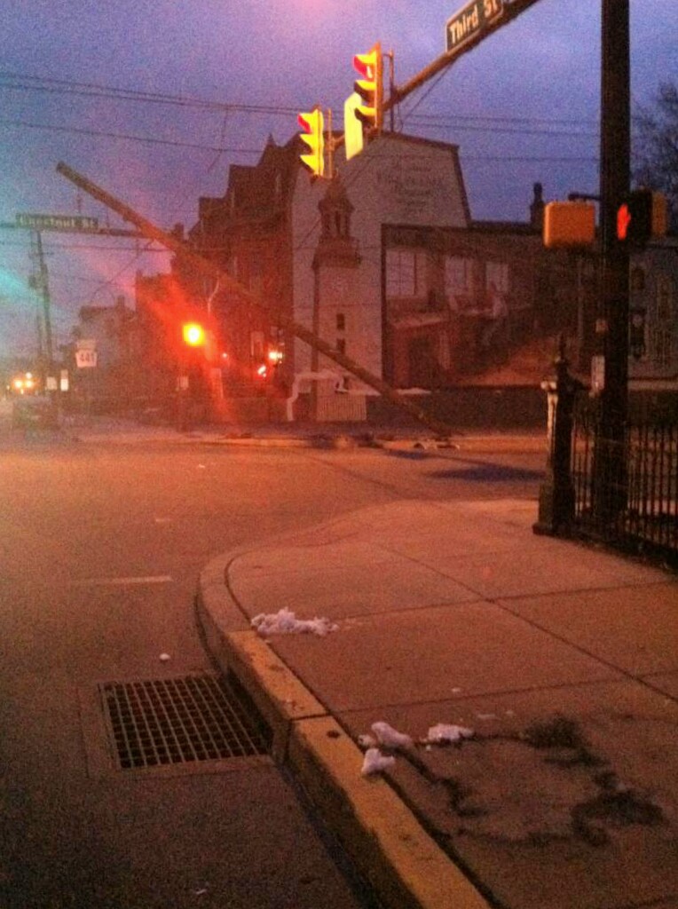 Pole down at 3rd & Chestnut Photo: Sharon Lintner Currently (7:15 a.m.), Chestnut Street is closed from 2nd to 4th. Share this: Share on X (Opens in new window) X Share on Facebook (Opens in new window) Facebook More Share on Bluesky (Opens in new window) Bluesky Share on X (Opens in new window) X Like Loading... Related