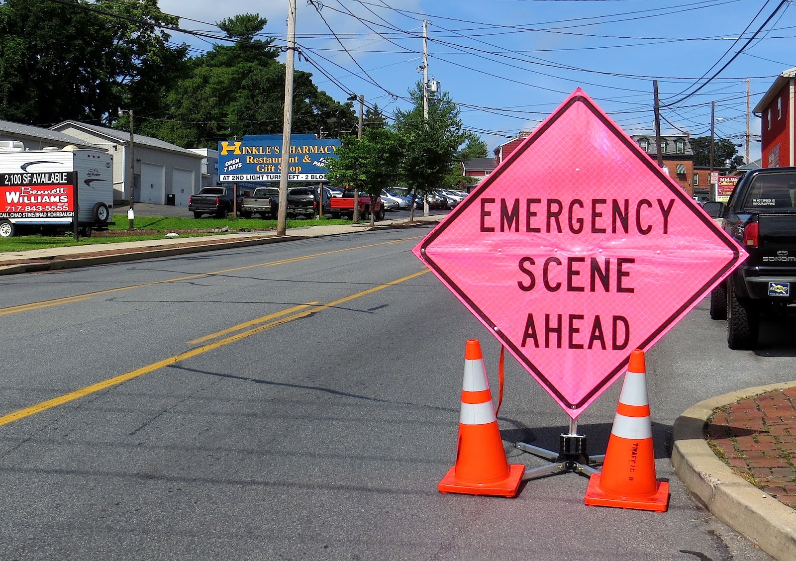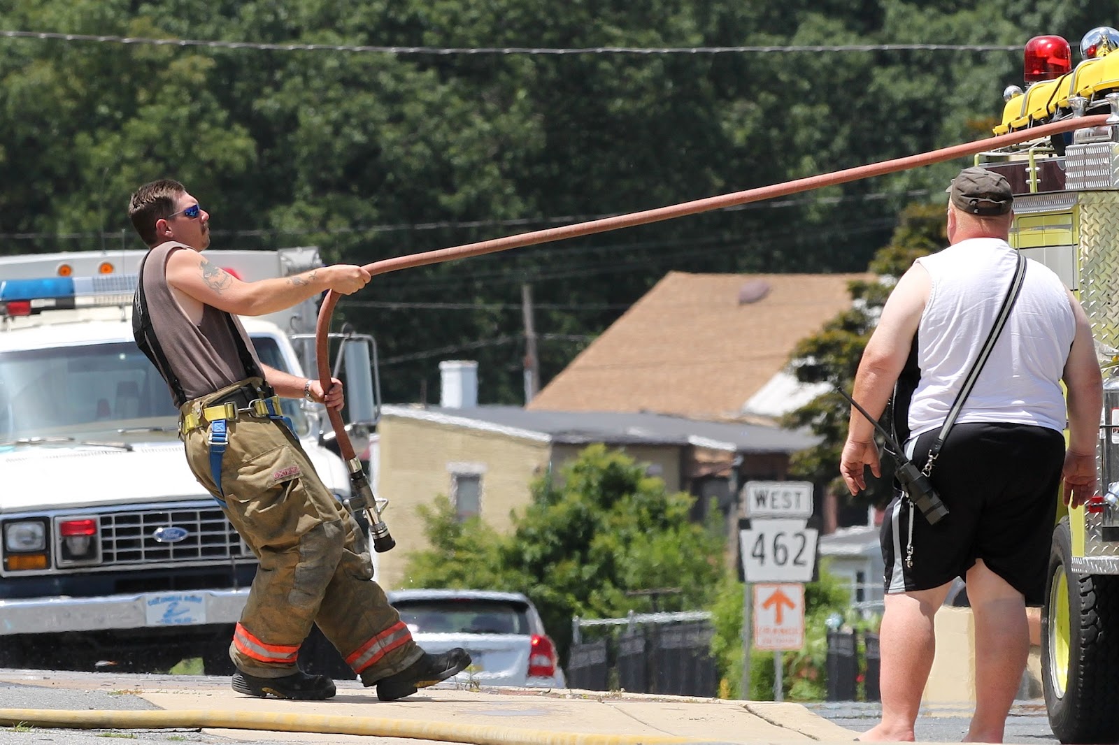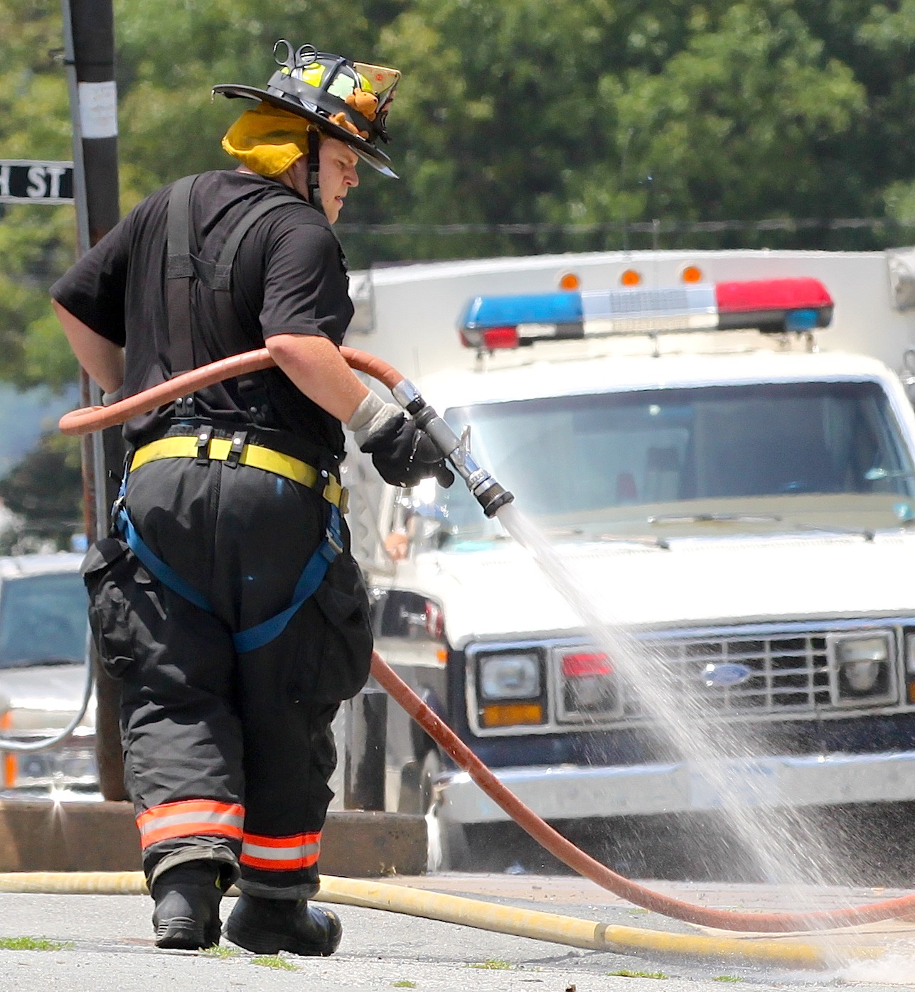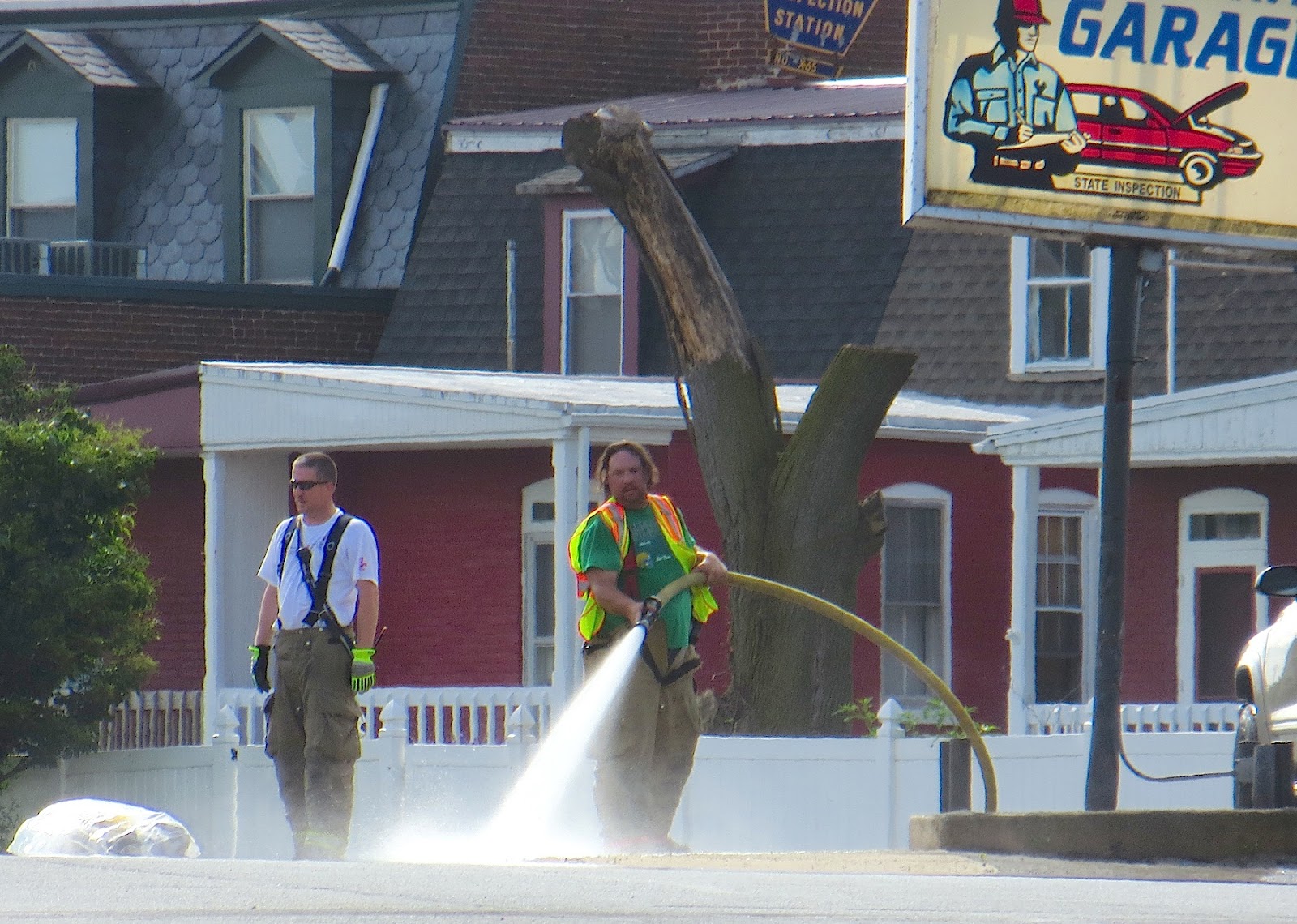 The following three photos show emergency personnel hosing down the Lancaster Avenue Garage parking lot, where the accident occurred this morning.