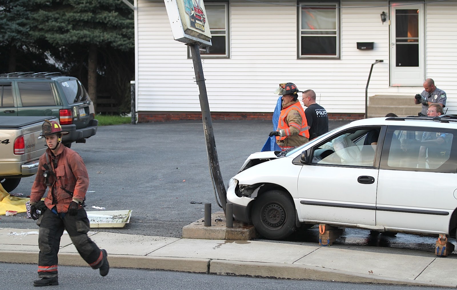 Emergency personnel responded to a vehicle accident at Lancaster Avenue and South Sixth Street today at 6:12 a.m. A pedestrian and a 70-year-old man, an occupant of the vehicle, were killed. A 66-year-old woman, another vehicle occupant, was taken to the hospital. The vehicle, a white Plymouth van, hit the pedestrian before slamming into the sign post at Lancaster Avenue Garage.