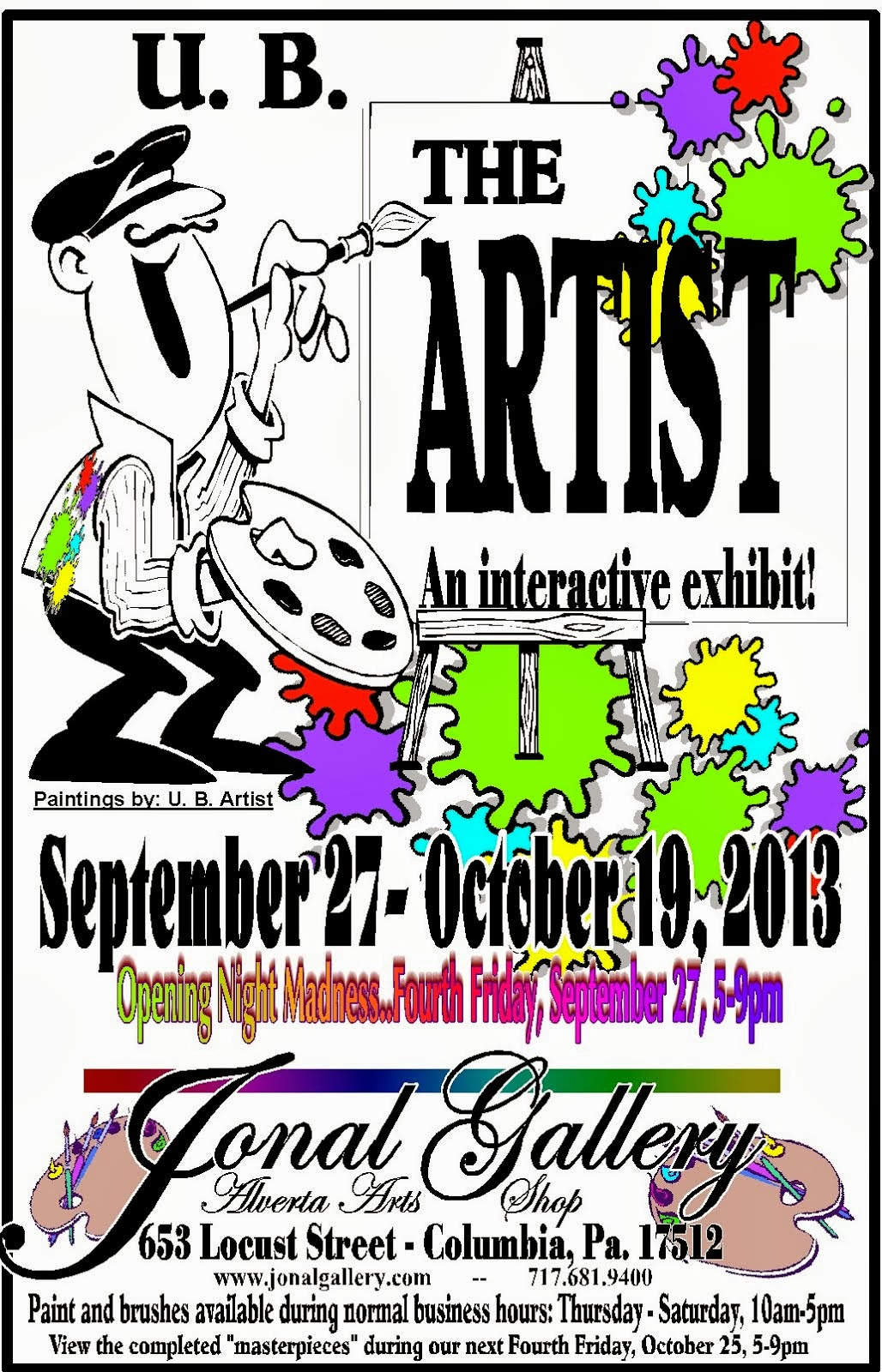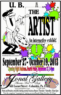 for themselves – it indicates that this food bank is needed now, more than ever before. Peters states “No man, woman or child should have to go to bed hungry; no stranger nor neighbor Yet, these figures prove that many would, if not for the assistance provided by us…” Now the twist… Starting on Friday (5-9pm) and continuing through October 19, we will transform our Labyrinth Gallery into a full fledged “artist studio” complete with blank canvases, acrylic paints, artist's palettes and brushes. The perfect setting for the creations of U.B. Artist's work.