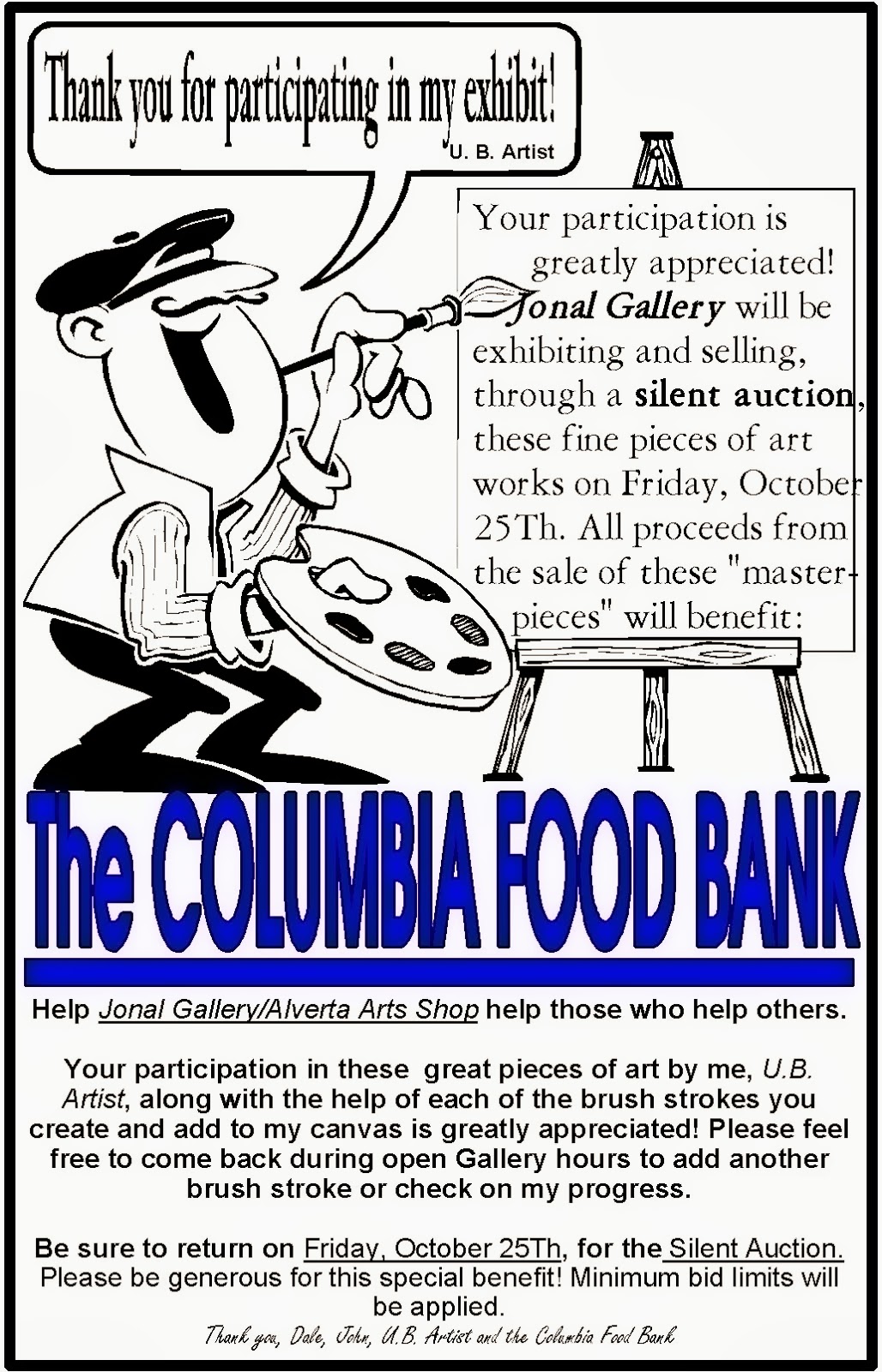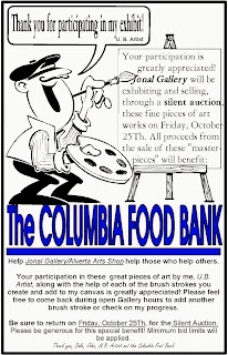 The Final twist… The Gallery is donating all supplies (canvases, paints, palettes and brushes) to help U.B. Artist complete the “masterpieces”. On our Fourth Friday event in October (October 25) all of U.B. Artist's canvases will be on display and offered up for sale during a Silent Auction held between 5-9pm (minimum bids will be applied to each piece). ALL proceeds from the Silent Auction will go directly to the benefit of the Columbia Food Bank.