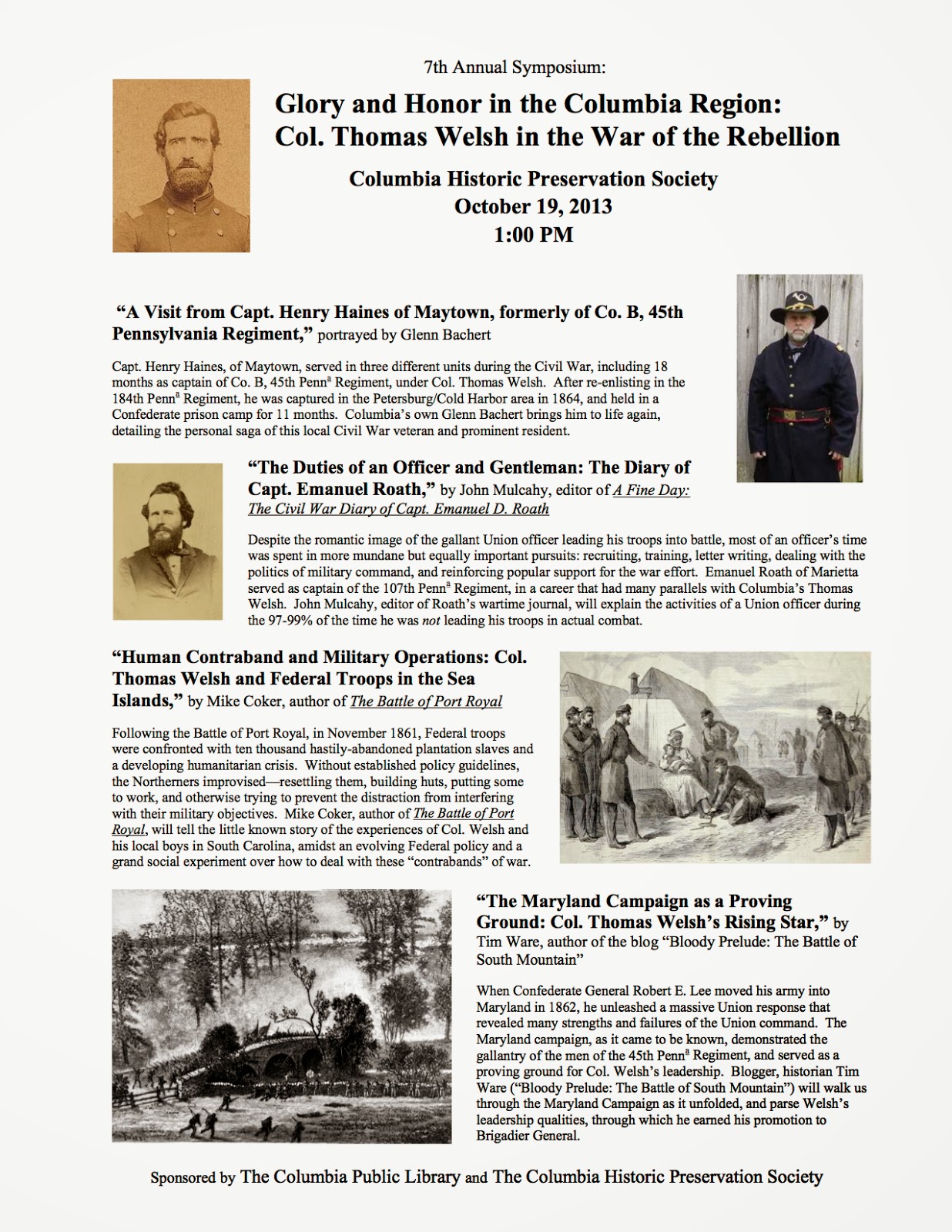 Rick Wiggins has been conducting an annual Symposium in Columbia for seven years about Columbia native son, Union Civil War General Thomas Welsh. Each year, the event has drawn scores of Columbians and area residents interested in their local history. This year’s event is jointly sponsored by the Columbia Historic Preservation Society (CHiPS) and the Columbia Public Library and will take place at 1 p.m. on Saturday, October 19 at the Columbia Historic Preservation Society, 19-21 North Second Street.