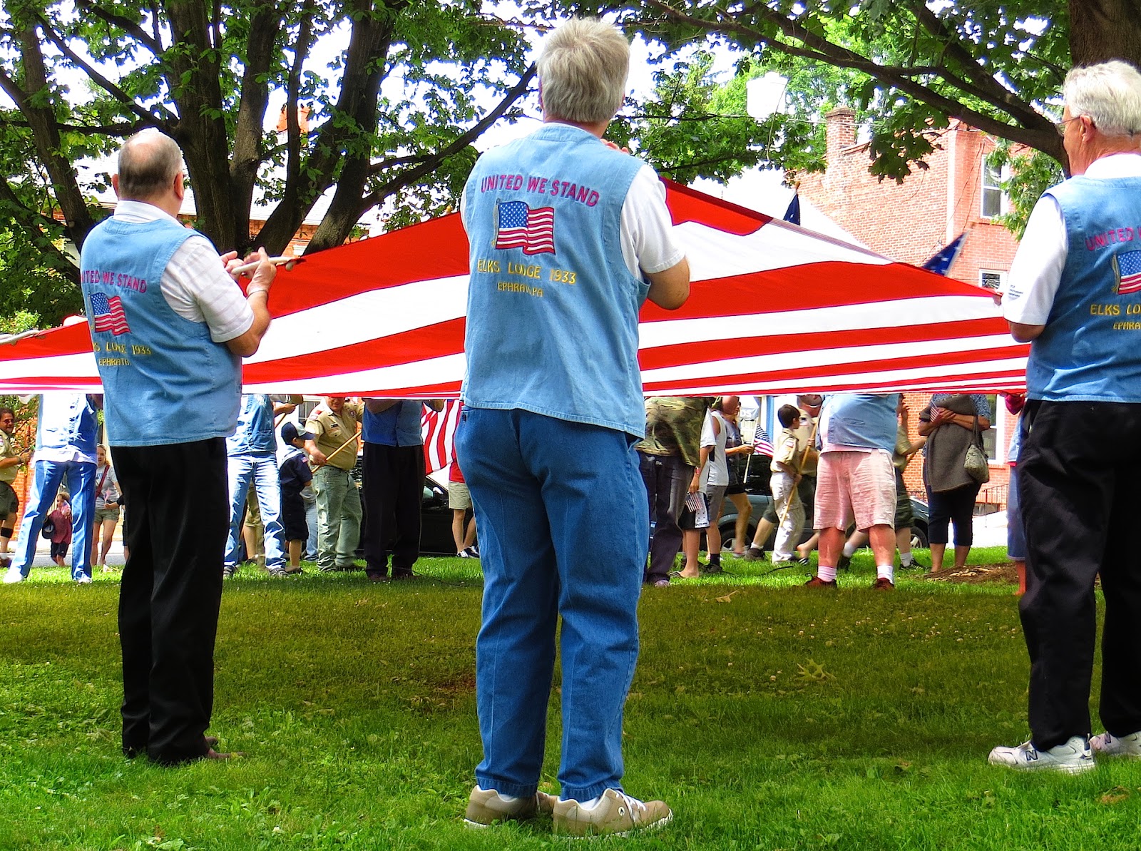 Columbia Borough celebrated Flag Day on Saturday with the help of the Elks of Lancaster County, Boy Scouts and Cub Scouts from Troops 35, 66, and 181, and a fife and drum corps from the First Regiment of the Pennsylvania Reserve Corps. Participants carried a 20- x 30-foot flag from 3rd and Locust Streets to Locust Street Park where the flag was folded. The commemoration continued at the park with several speakers as well as a display by the scouts of several historical American flags.