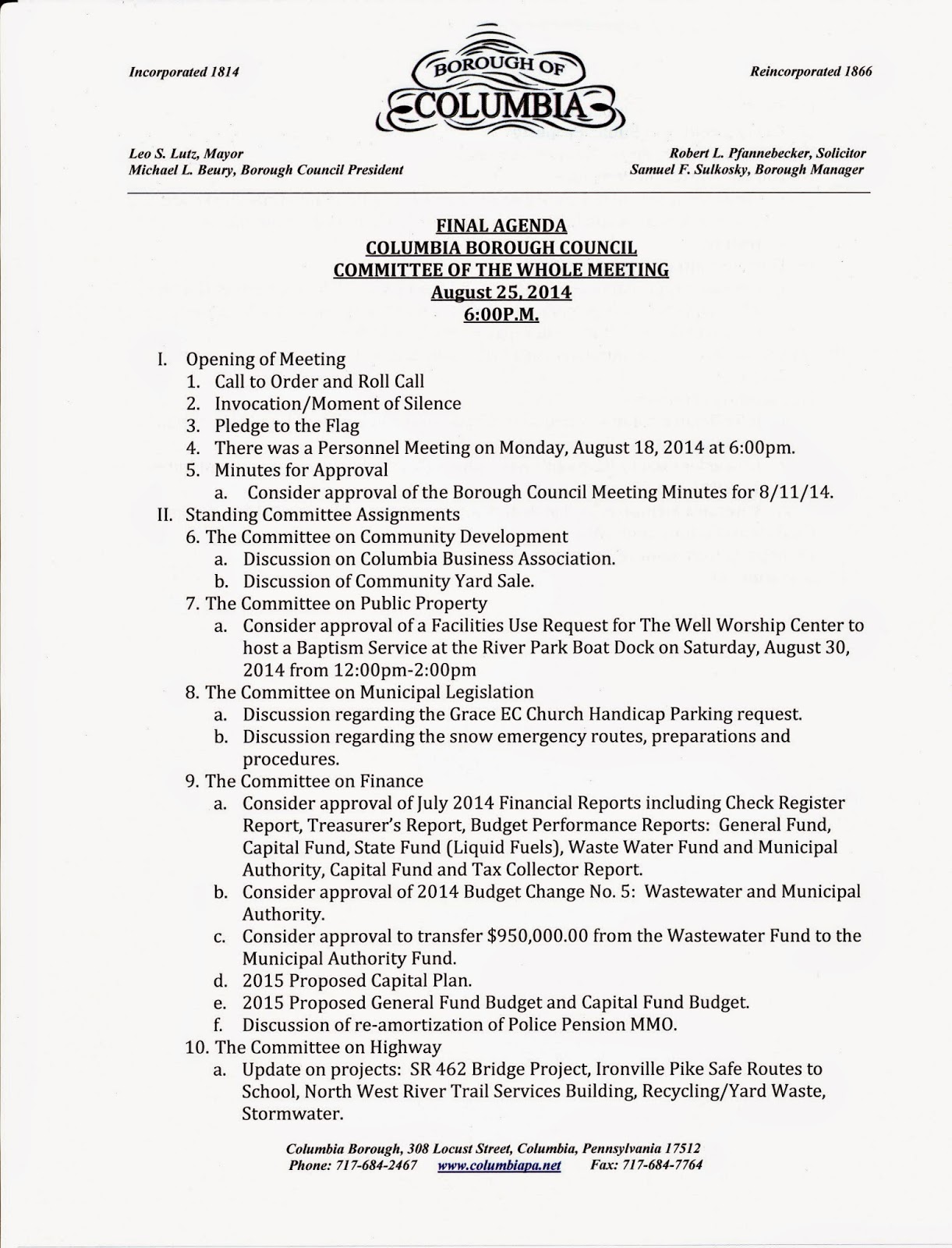 Columbia Borough Council Committee of the Whole Meeting Agenda – August 25, 2014 Details to follow Share this: Share on X (Opens in new window) X Share on Facebook (Opens in new window) Facebook More Share on Bluesky (Opens in new window) Bluesky Share on X (Opens in new window) X Like Loading... Related