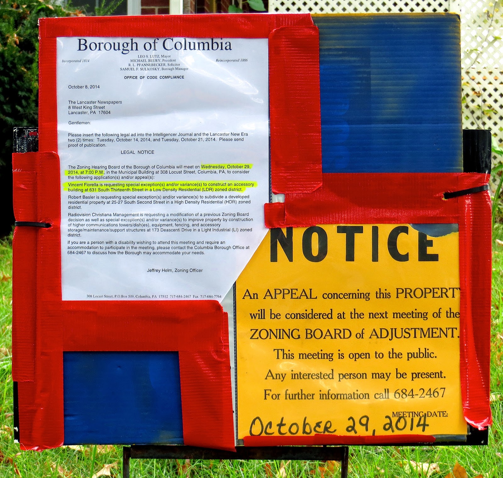 LEGAL NOTICE The Zoning Hearing Board of the Borough of Columbia will meet on Wednesday, October 29, 2014, at 7:00 P.M., in the Municipal Building at 308 Locust Street, Columbia, PA, to consider the following application(s) and/or appeal(s): Vincent Fiorella is requesting special exception(s) and/or variance(s) to construct an accessory building at 631 South Thirteenth Street in a Low Density Residential (LDR) zoned district. Robert Basler is requesting special exception(s) and/or variance(s) to subdivide a developed residential property at 25-27 South Second Street in a High Density Residential (HDR) zoned district. Radiovision Christiana Management is requesting a modification of a previous Zoning Board decision as well as special exception(s) and/or variance(s) to improve property by construction of higher communications towers/ dish(es), equipment, fencing, and accessory storage/maintenance/support structures at 173 Deascenti Drive in a Light Industrial (LI) zoned district. If you are a person with a disability wishing to attend this meeting and require an accommodation to participate in the meeting, please contact the Columbia Borough Office at 684-2467 to discuss how the Borough may accommodate your needs. Jeffrey Helm, Zoning Officer