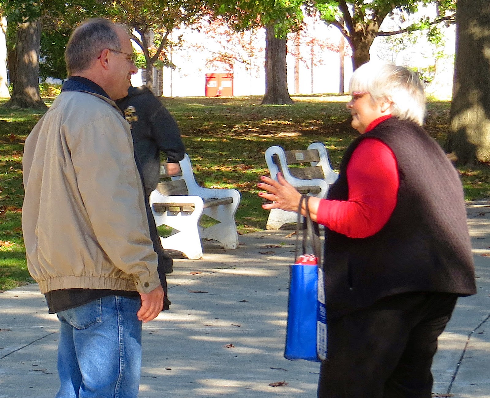 Vision Columbia Pastor Clair Good talks to Brenda Petroski at Locust Street Park