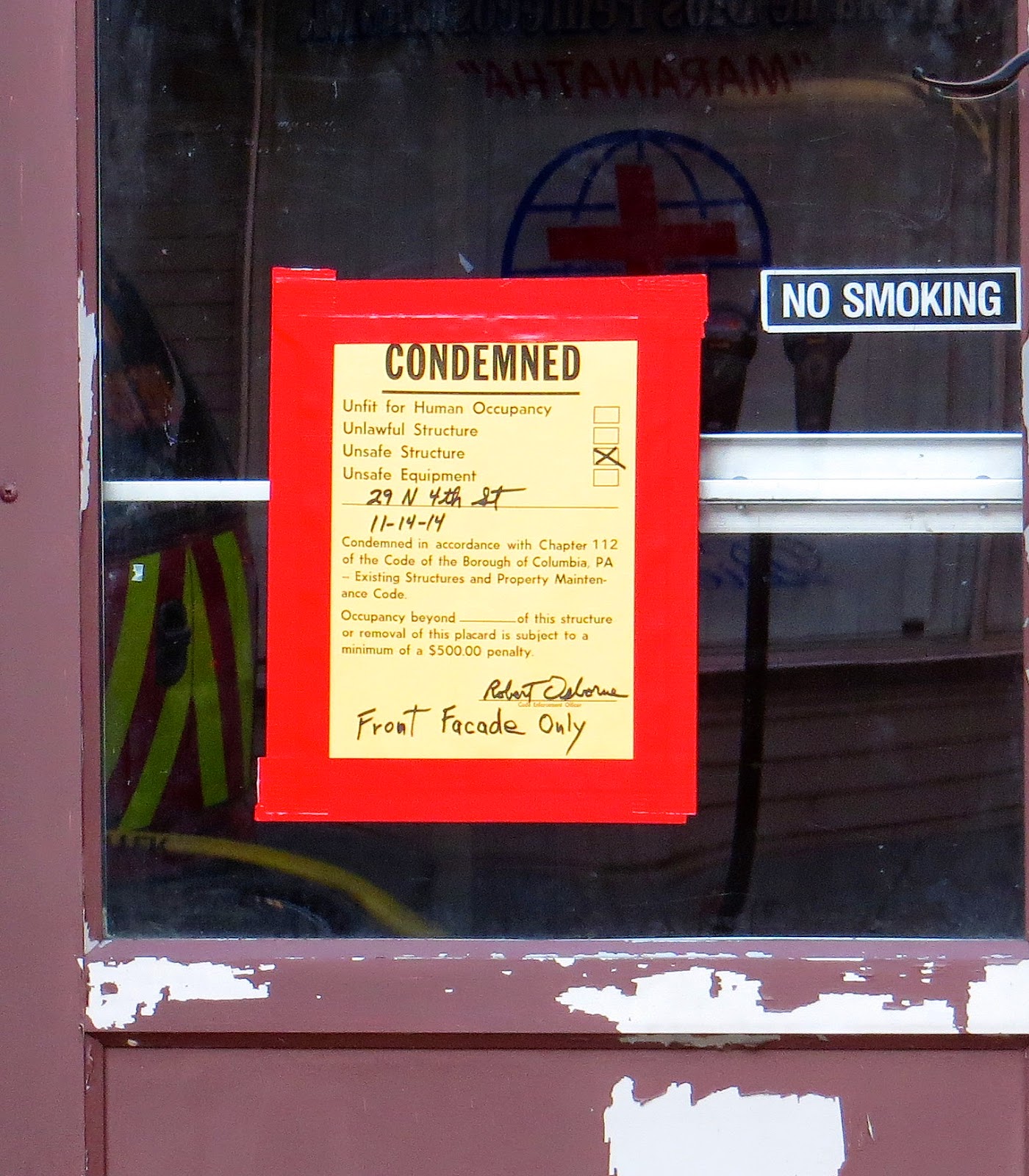 What I Saw – November 18, 2014 Hey, where’s the camera? Hey, where’s the light? At least we have the time . . . and a sign of the times . . . at the old Keystone Fire Company building. It’s definitely time to go. Share this: Share on X (Opens in new window) X Share on Facebook (Opens in new window) Facebook More Share on Bluesky (Opens in new window) Bluesky Share on X (Opens in new window) X Like Loading... Related