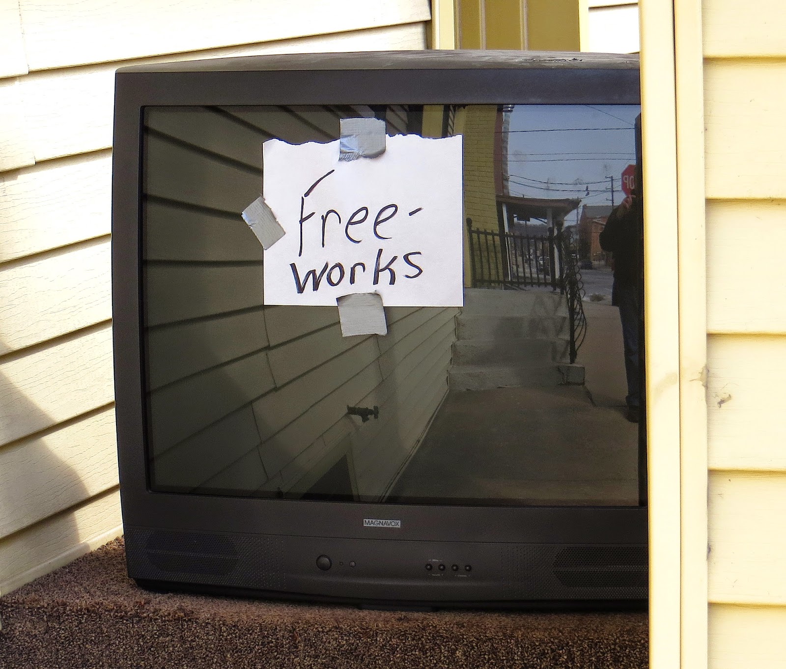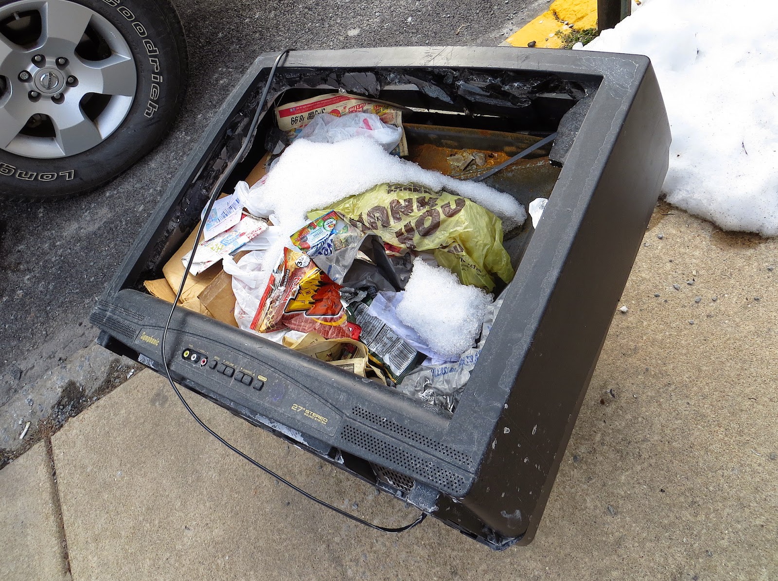 What was once a TV is now a trash receptacle