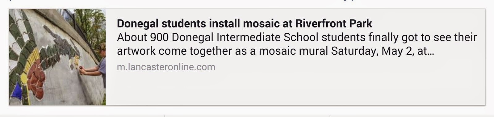 Donegal students install mosaic at Riverfront Park Artist-in-residence Kevin Lehman is helping the students complete the project. Lehman has helped kids at least a half dozen times in creating mosaic murals. MORE: http://m.lancasteronline.com/donegal/news/donegal-students-install-mosaic-at-riverfront-park/article_8b92bbaa-f45f-11e4-8eb3-bf4a53dad855.html?mode=jqm Share this: Click to share on X (Opens in new window) X Click to share on Facebook (Opens in new window) Facebook More Click to share on Bluesky (Opens in new window) Bluesky Click to share on X (Opens in new window) X Like Loading... Related