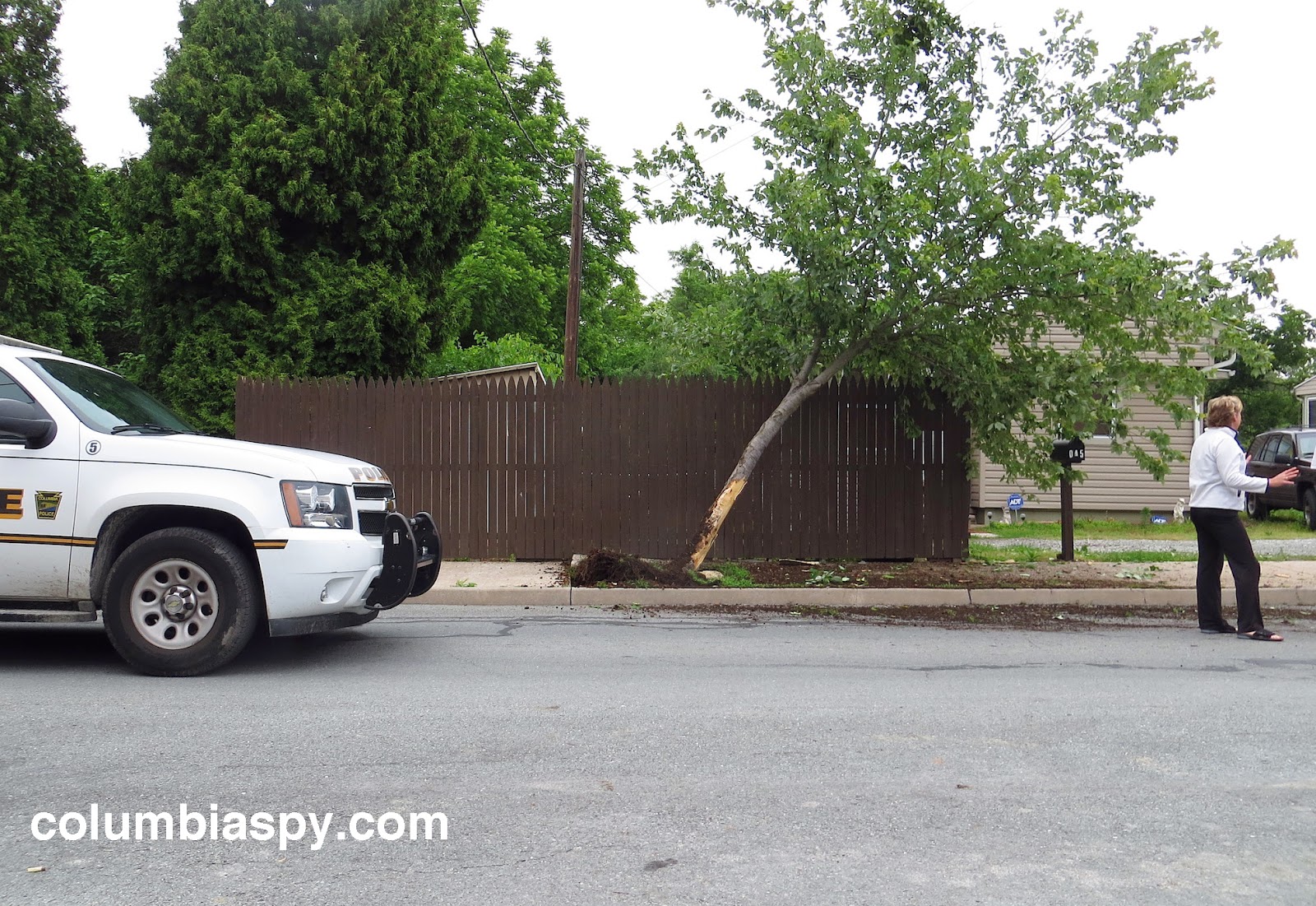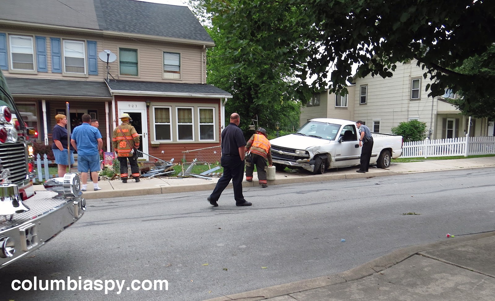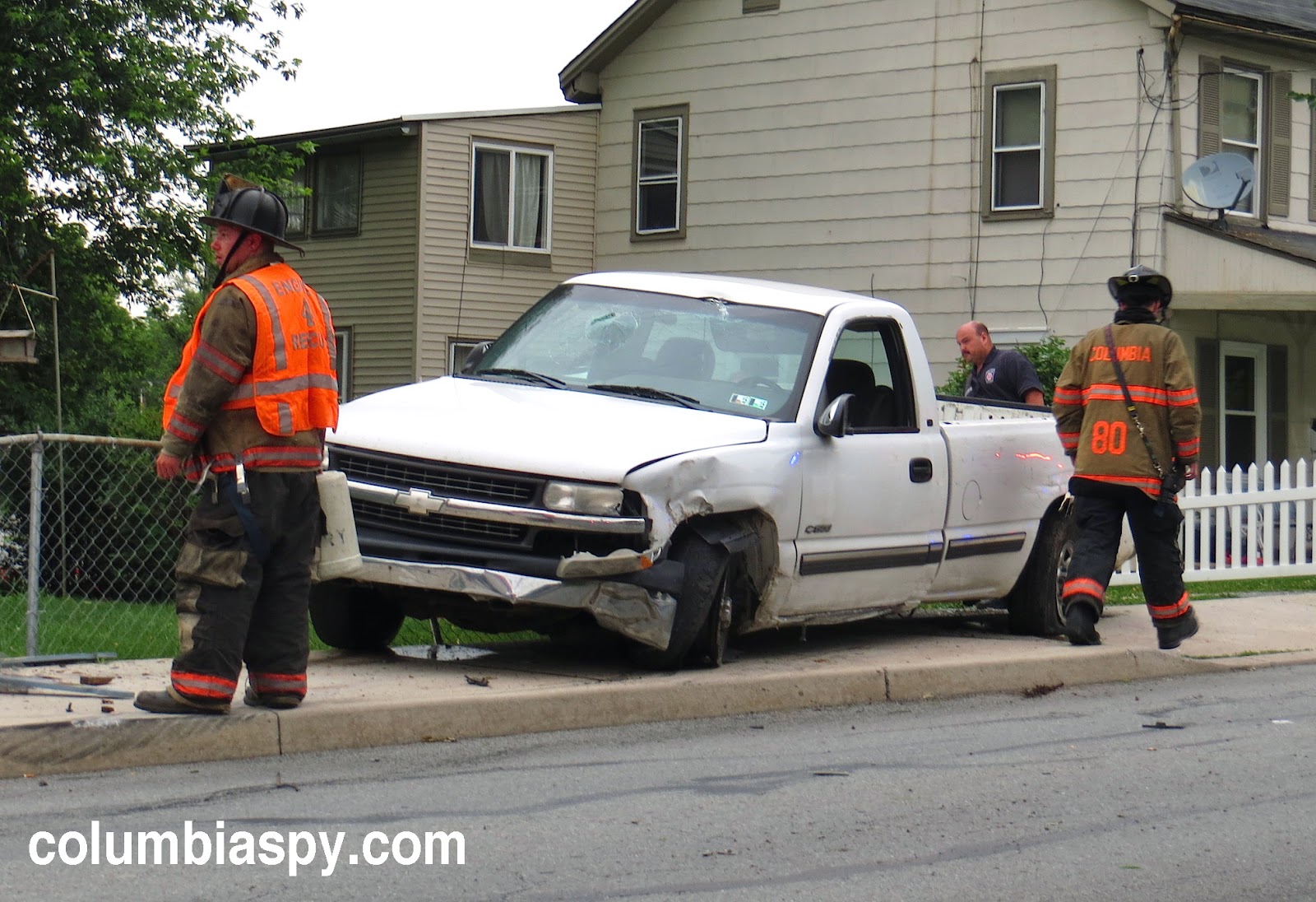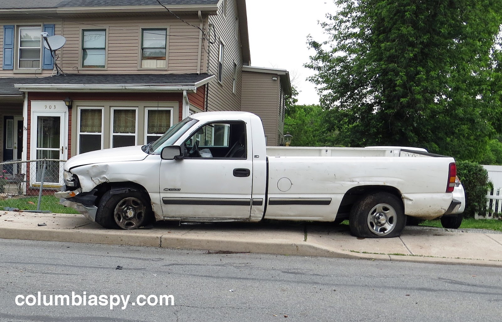 Emergency personnel responded to a vehicle accident on the 900 block of Barber Street at about 7:30 this evening.  A white Chevy pickup truck came to rest on the sidewalk along the one-way street after shearing off a traffic sign post, damaging a tree, and mangling a fence.  The truck sustained front end damage and at least two blown tires. The driver left the vehicle and fled on foot westward along Barber. Witnesses said he told them he was injured and was holding his wrist as he fled. The pickup truck had reportedly sped down Plane Street and onto Barber immediately before the driver lost control. Police identified the driver from evidence at the scene.