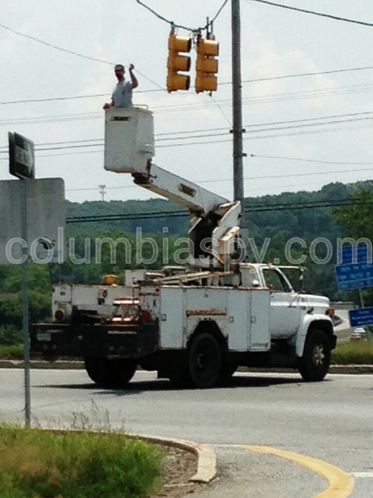 A workman drove ahead to lift utility wires to allow the tank to pass.