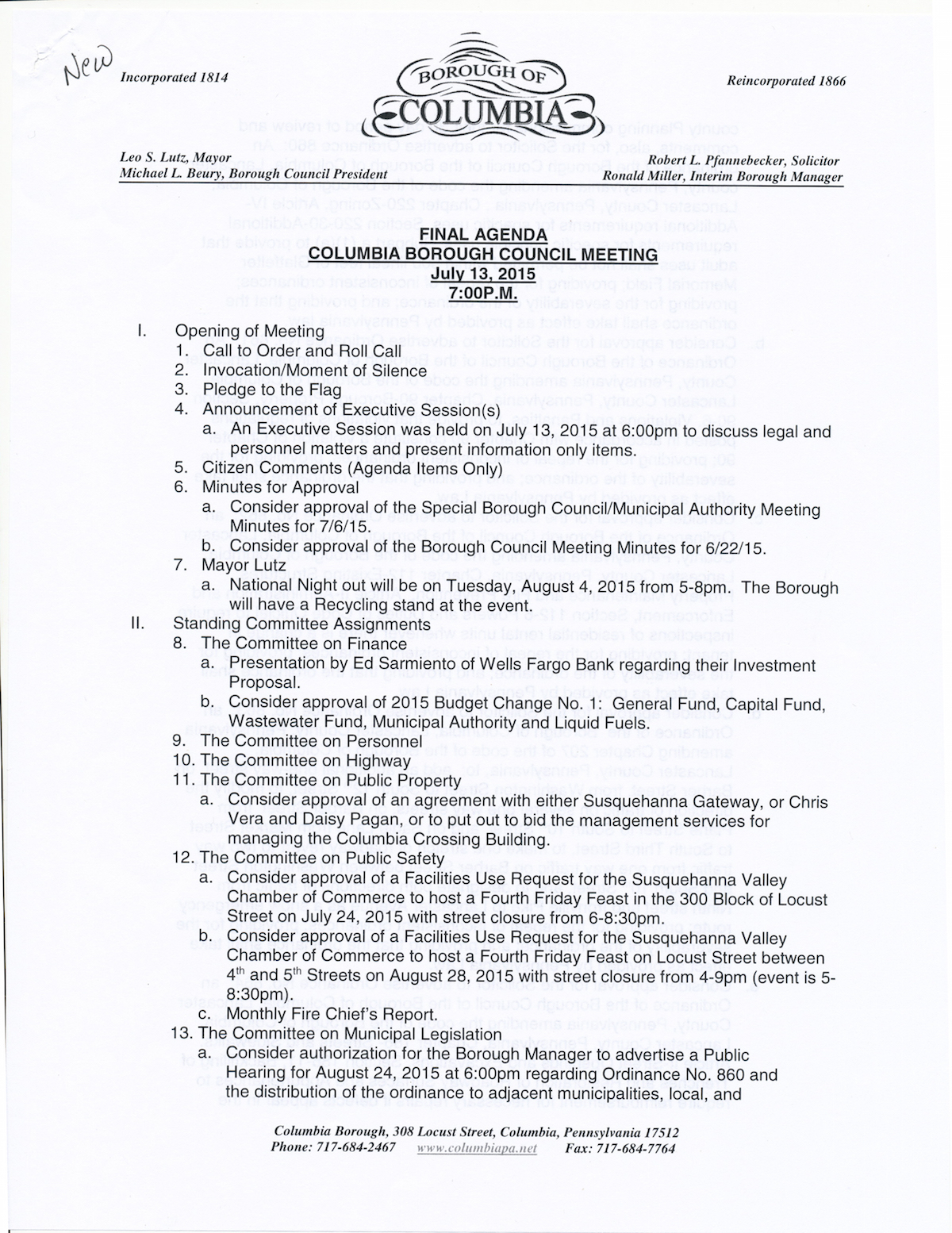 Agenda – Columbia Borough Council Meeting July 13, 2015 Share this: Share on X (Opens in new window) X Share on Facebook (Opens in new window) Facebook More Share on Bluesky (Opens in new window) Bluesky Share on X (Opens in new window) X Like Loading... Related