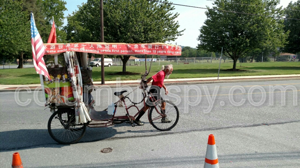 This gentleman was seen this morning trudging up the hill on Lancaster Avenue, near Glatfelter’s. When asked why he was doing this, he replied, “No English.” It turns out he is Chen Guan Ming, a Chinese rice farmer who is on his way to the 2016 Olympics in Rio de Janeiro, Brazil. More info can be found on his website HERE.