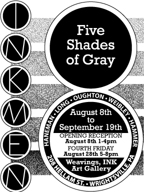 Bob Hammer is participating in INKMEN8: Five Shades of Gray starting tomorrow, August 8, and running to September 29 at Weavings, INK Art Gallery, 208 Hellam Street, Wrightsville.