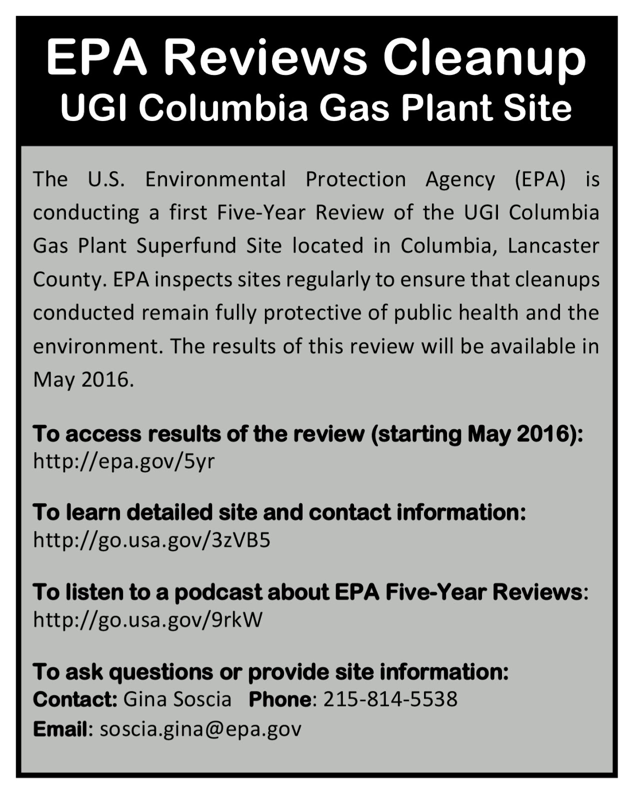 The U.S. Environmental Protection Agency (EPA) is conducting a first Five-Year Review of the UGI Columbia Gas Plant Superfund Site located in Columbia. Columbia Borough has purchased the former gas plant property and is reusing the property for the Borough’s vehicle maintenance garage and road salt storage facility. EPA inspects sites regularly to ensure that cleanups conducted remain fully protective of public health and the environment. The review will be finalized by May 2016.