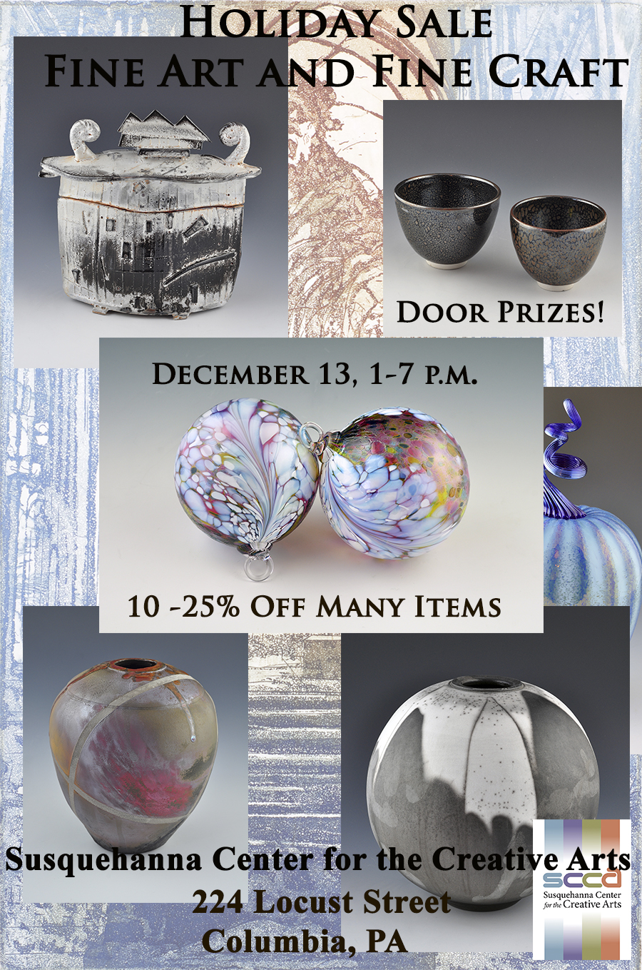 Please join us for our Annual Holiday Sale! Many Fine Art and Fine Craft items are offered at 10-25% off retail. Put your name in for one of our Art Door Prizes on December 13, 1-7 p.m. Prizes will be drawn at the end of the day. We have a fine selection of drawings, ceramics (pottery), fiber, glass, paintings, prints, Sculpture and mixed media work!