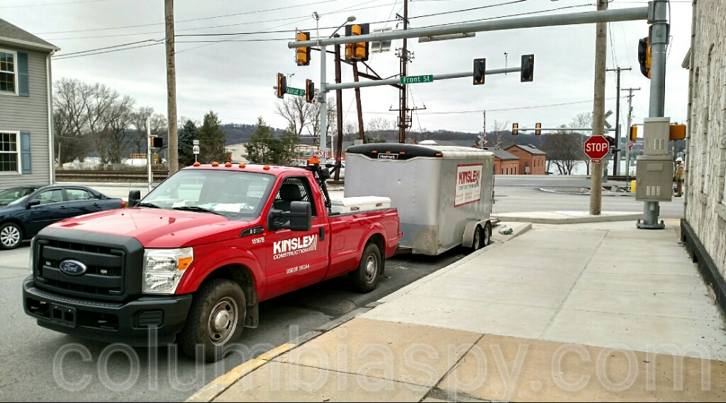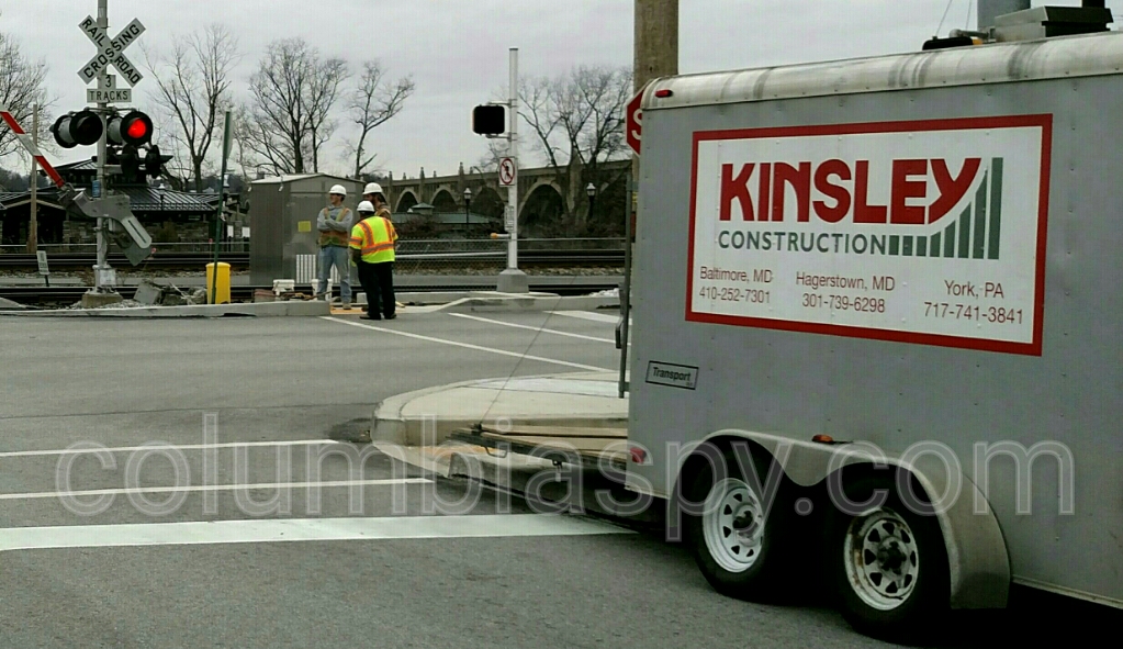 No, they were not “standing around”. They poured fresh cement today and had removed sizeable chunks of old concrete. In addition they installed another yellow (ADA) pad. It would have been beyond dangerous for them to continue working while the train was passing within a couple feet.