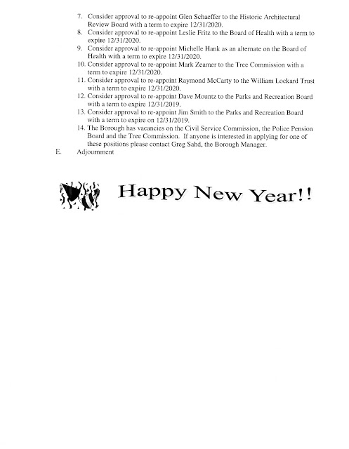 Council also reappointed engineering firm CS Davidson as borough engineer. Other borough authority, board, and/or commission members (shown in the agenda below) were reappointed to their respective positions.