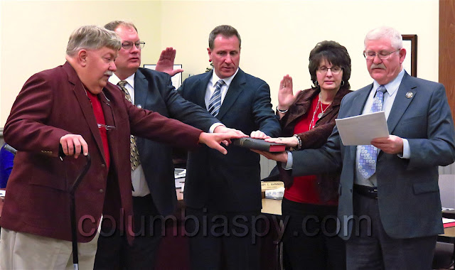 Mayor Leo Lutz (right) swore in: (left to right) Councillor Barry Ford, Council President Kelly Murphy, Councillor Cleon Berntheizel, and Council Vice-President Mary Barninger.