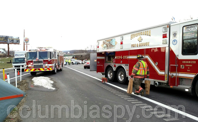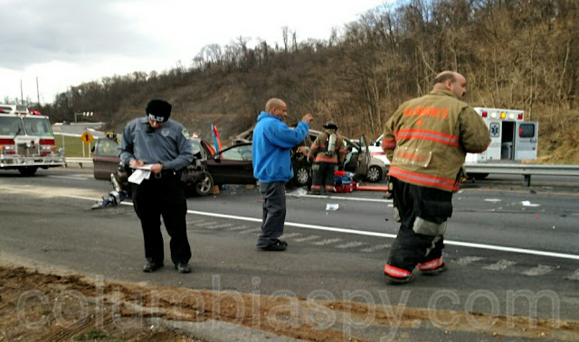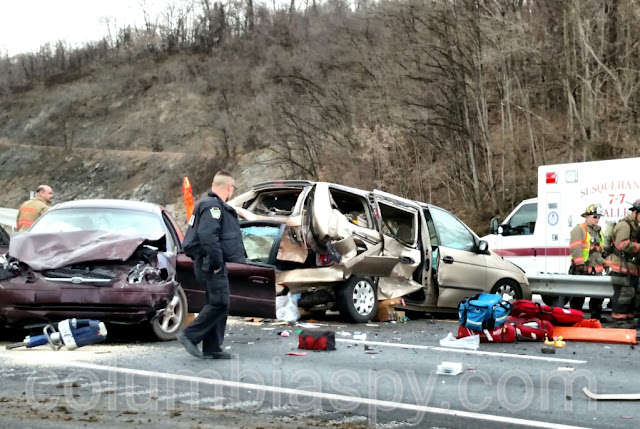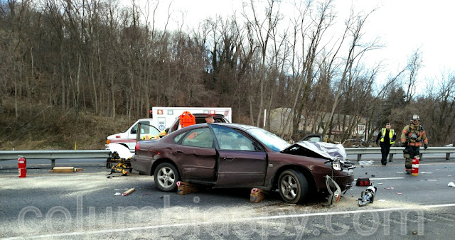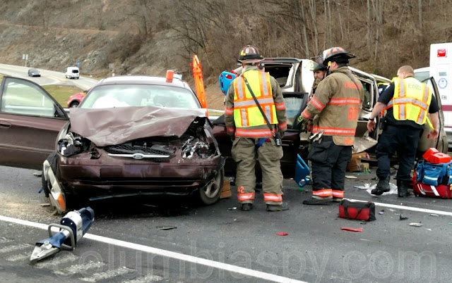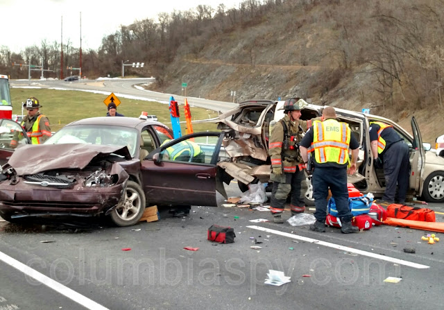 A four-vehicle accident closed the eastbound lane of Route 30 just past the Route 441 overpass at about 2:30 this afternoon. Three people were taken from the scene by ambulance. Two of the vehicles, a Honda minivan and a Ford sedan, sustained severe damage and appeared to have been totaled. The female driver of the Ford and the female driver of the Honda were transported by ambulance, as was a young boy who was a passenger in the minivan. A Honda sedan sustained minor damage, and the driver appeared to be uninjured. Eastbound traffic was diverted at the Columbia exit near the Visitors Center.