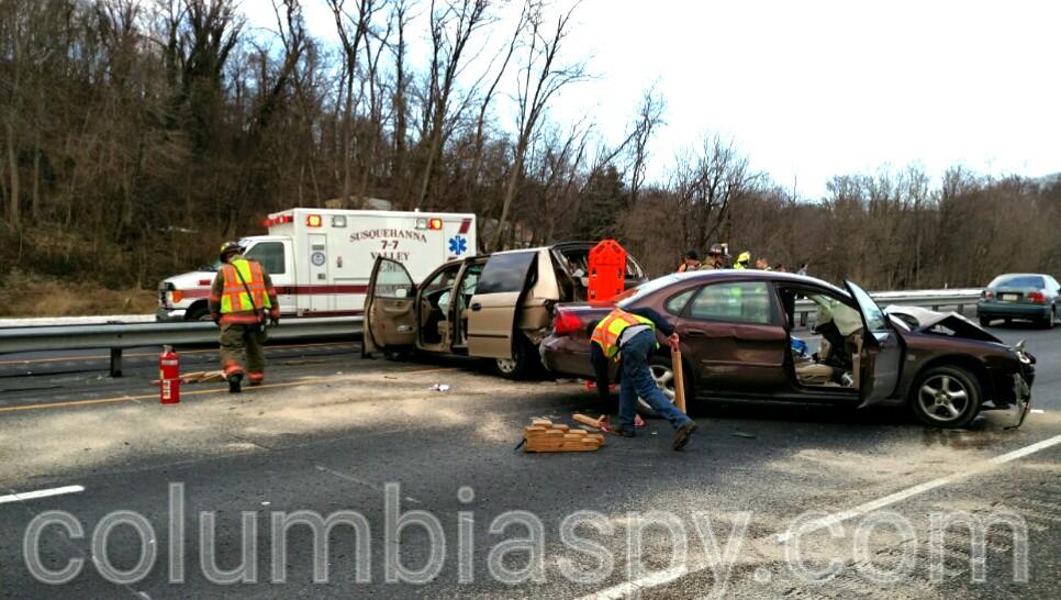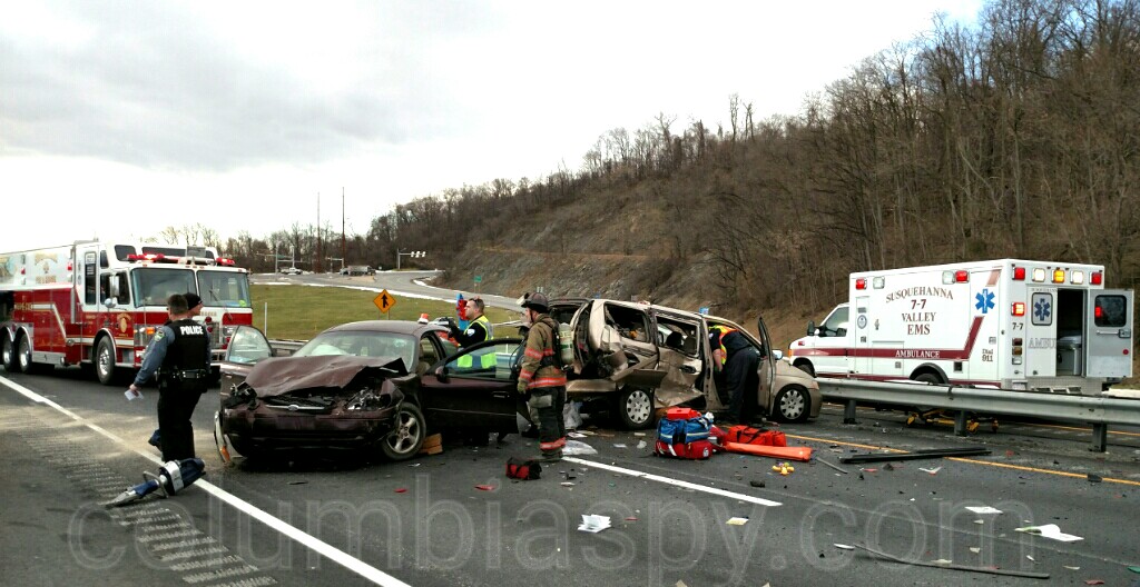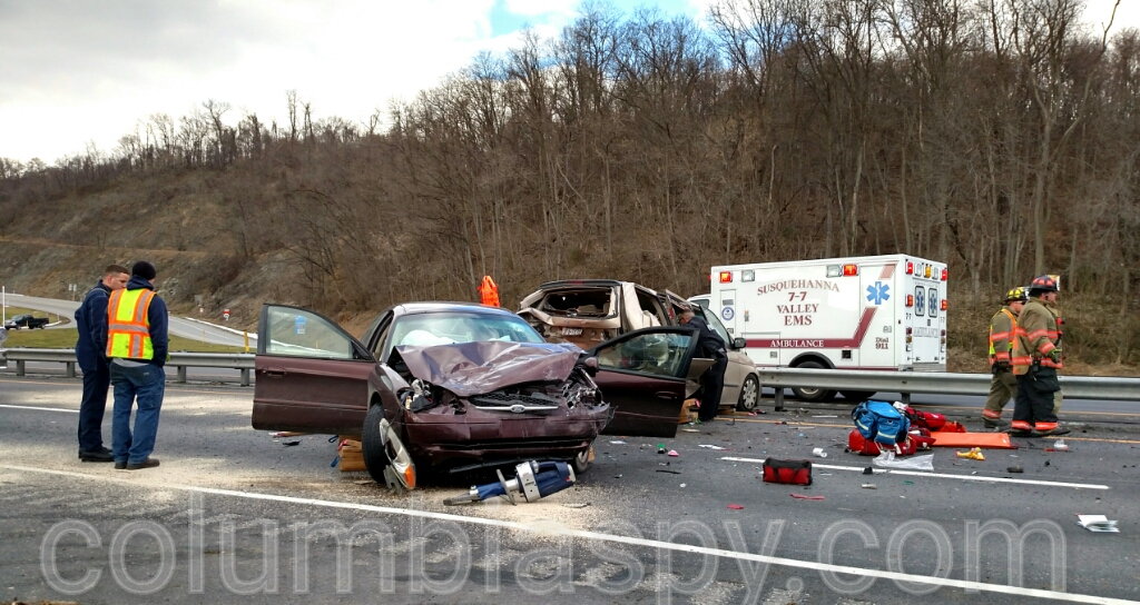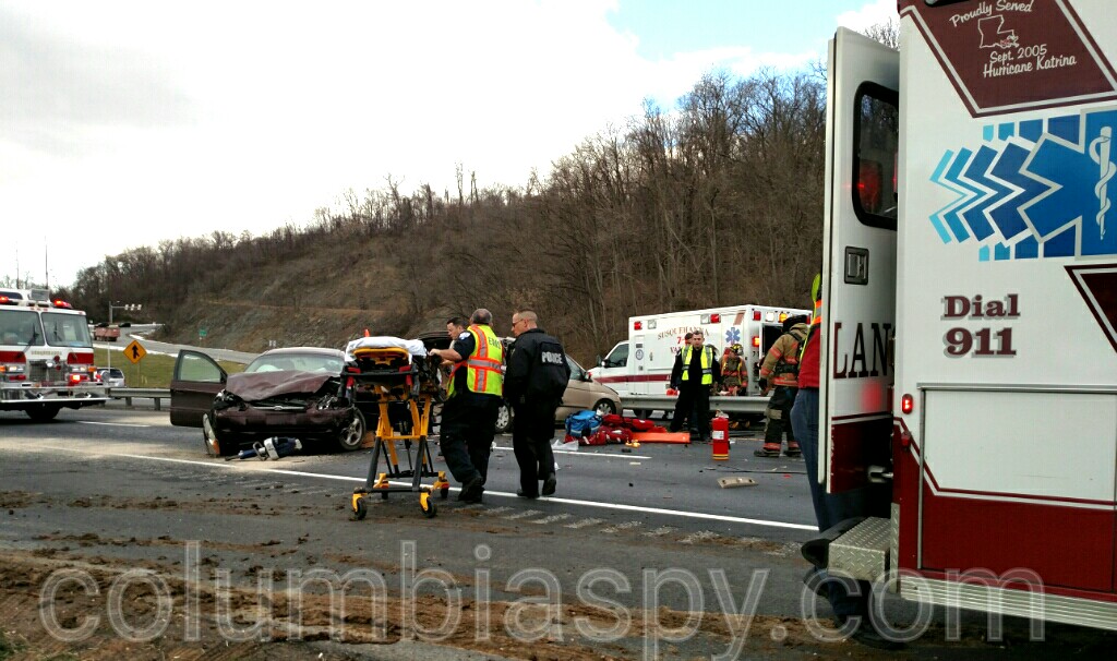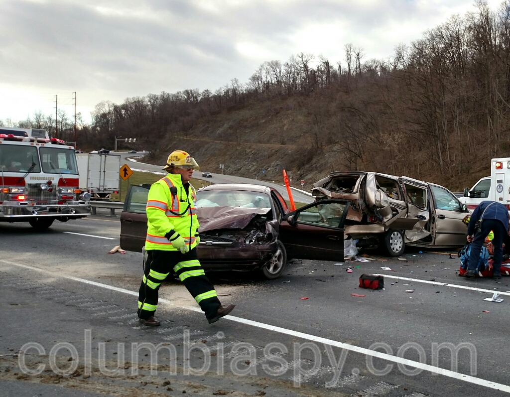 A four-vehicle accident closed the eastbound lane of Route 30 just past the Route 441 overpass at about 2:30 this afternoon. Three people were taken from the scene by ambulance. Two of the vehicles, a Honda minivan and a Ford sedan, sustained severe damage and appeared to have been totaled. The female driver of the Ford and the female driver of the Honda were transported by ambulance, as was a young boy who was a passenger in the minivan. A Honda sedan sustained minor damage, and the driver appeared to be uninjured. Eastbound traffic was diverted at the Columbia exit near the Visitors Center.