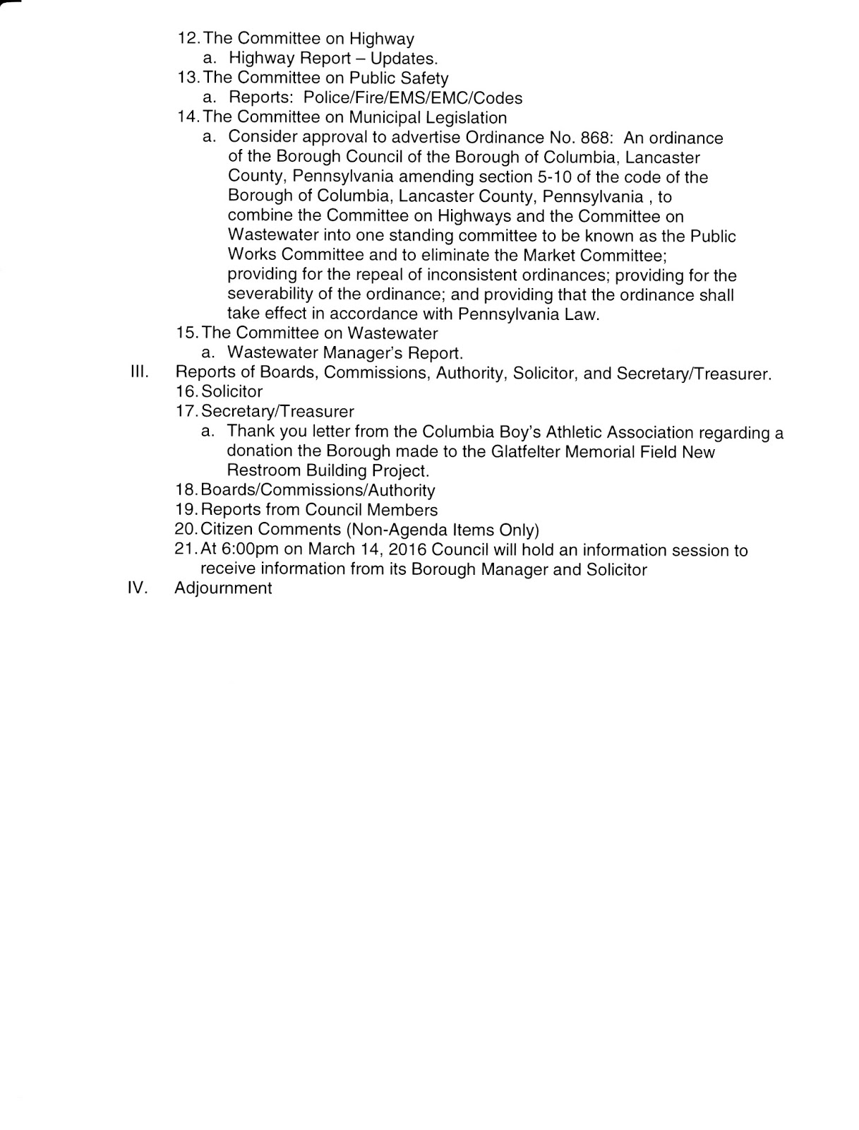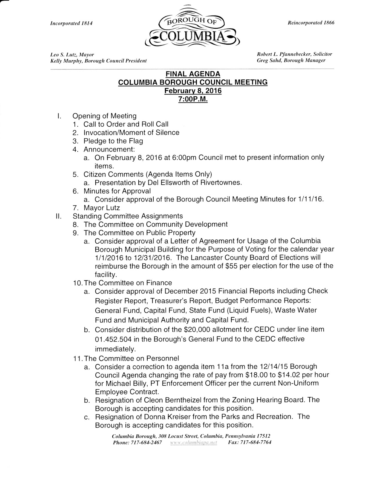 Agenda – Borough Council Meeting February 8, 2016