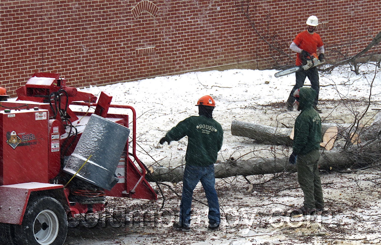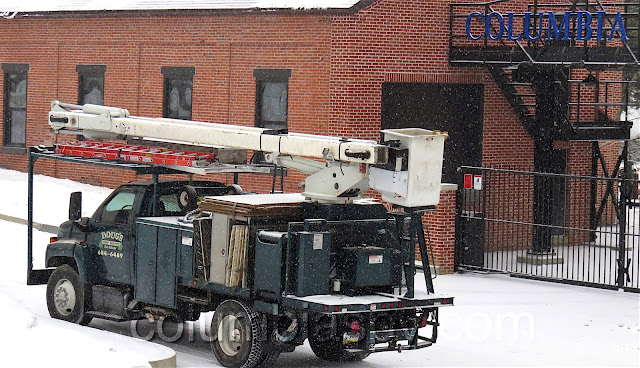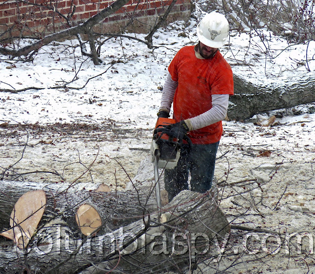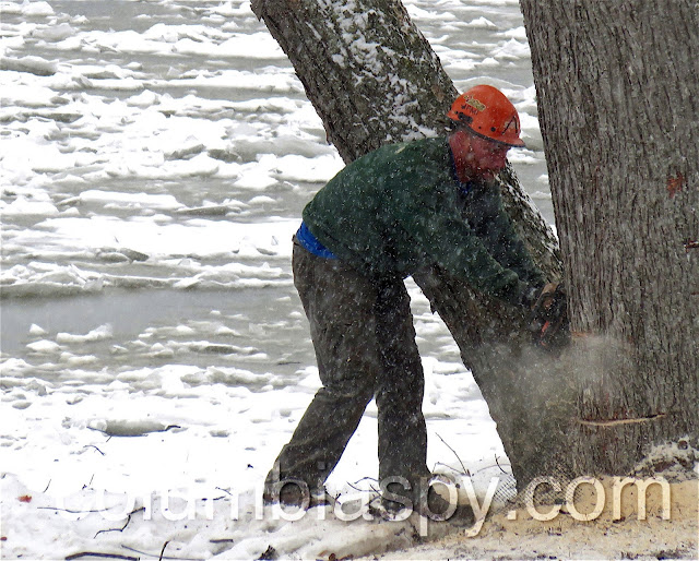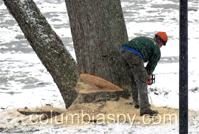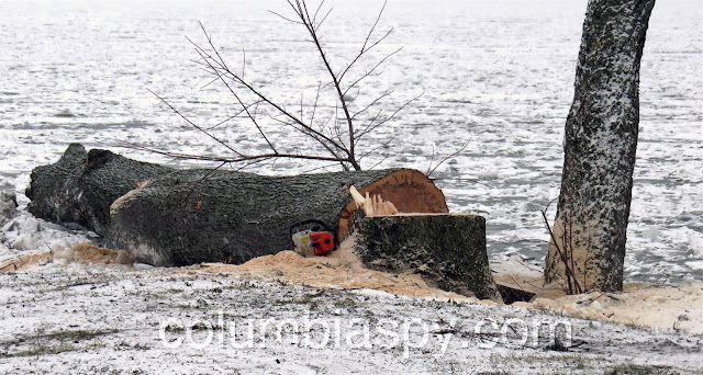 A Doug’s Tree Service crew worked over the holiday weekend to finish removing trees at Columbia River Park. Snow fell as the final trees were cut today.