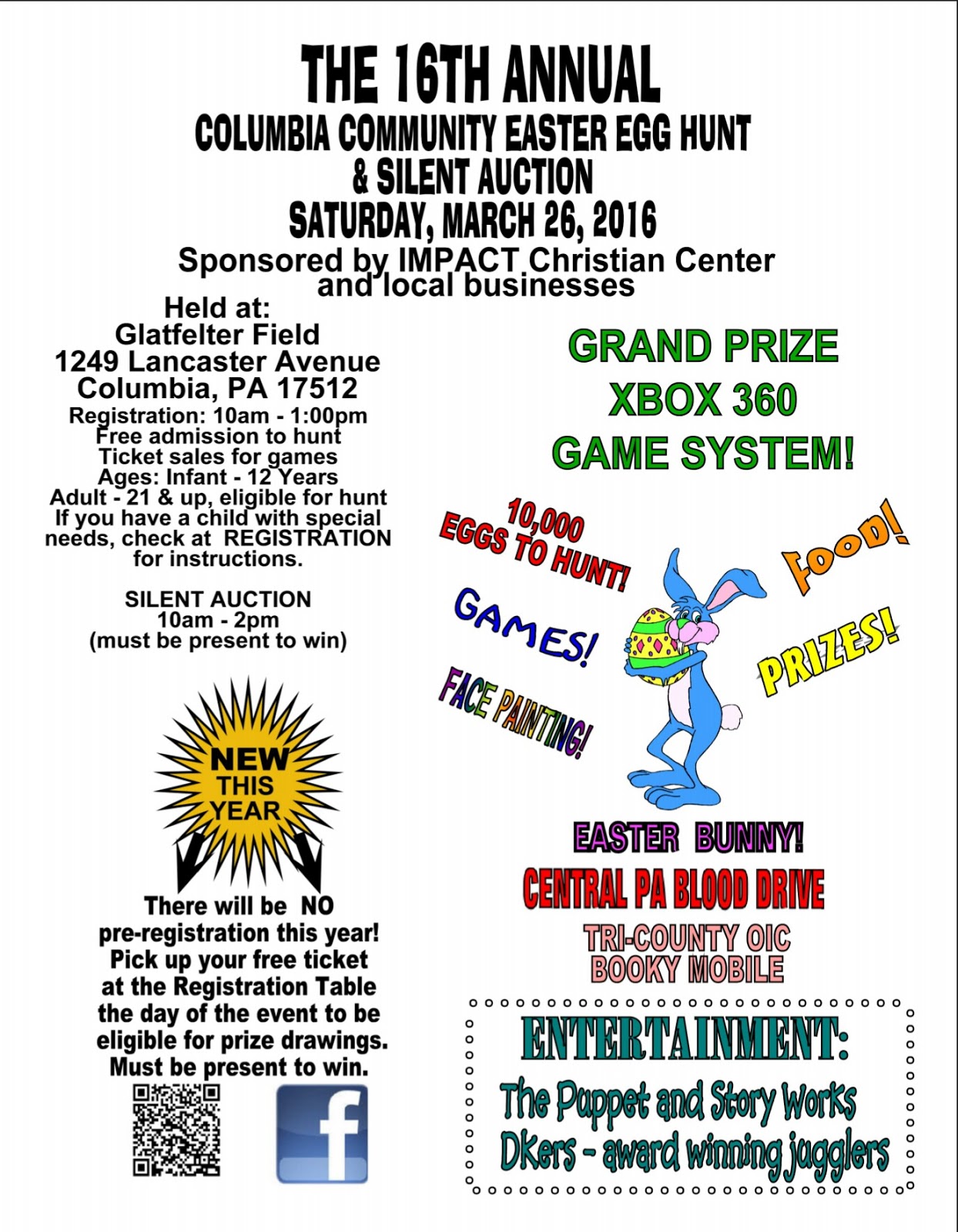 Easter Egg Hunt and Silent Auction March 26 Registration opens at 10 a.m. Egg hunts start at 1 p.m. Share this: Share on X (Opens in new window) X Share on Facebook (Opens in new window) Facebook More Share on Bluesky (Opens in new window) Bluesky Share on X (Opens in new window) X Like Loading... Related