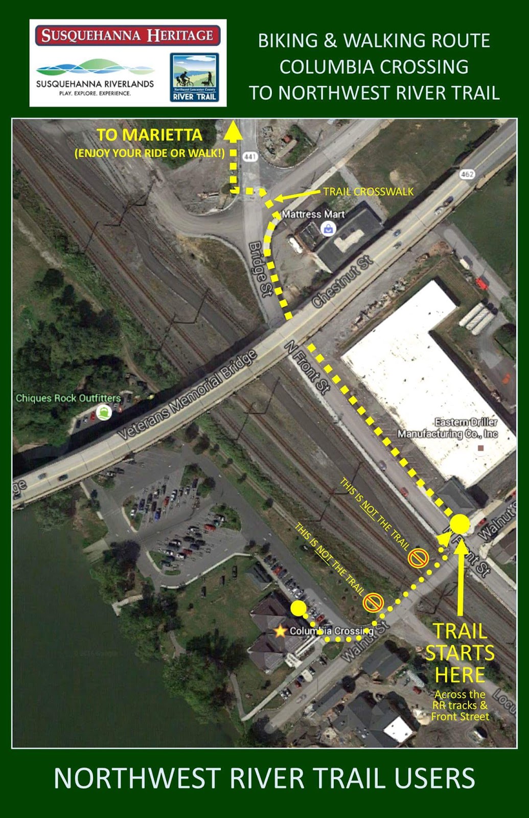 The map shown above might alleviate current confusion about the route to the Northwest River Trail. The trail requires walkers and bikers to leave Columbia River Park and travel north along North Front Street to the intersection with the new Route 441 bypass (and then onto the trail). Travelers should exercise caution when crossing at this intersection.