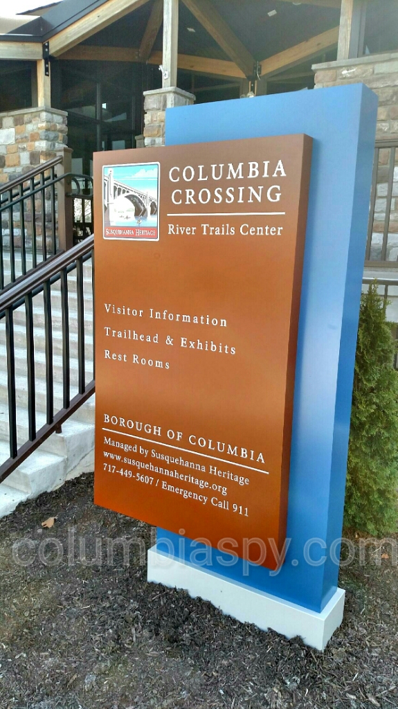 A new sign was installed yesterday at the Columbia Crossing building at Columbia River Park. The sign lists building information and is part of a new signage program related to the Northwest Lancaster County River Trail.