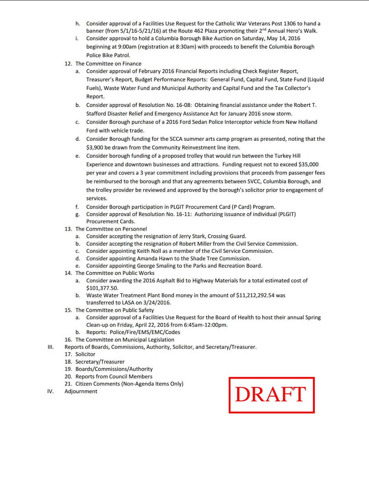 The draft agenda for the April 11, 2016 Columbia Borough Council meeting is posted on the borough website at columbiapa.net and is shown below. Draft agendas will now be posted on the borough’s site prior to meetings.