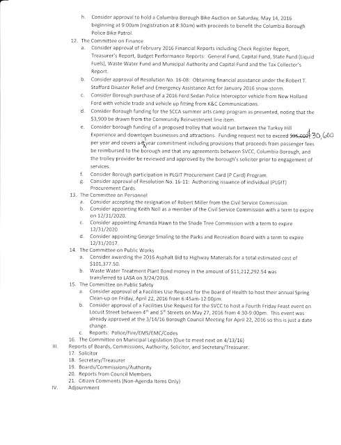 NOTE: Following is the final agenda presented at the April 11, 2016 Columbia Borough Council meeting. At the start of the meeting, Council President Kelly Murphy announced that Item II.11.b. “Consider approval of Resolution 16-09: DCNR Grant Application for Columbia River Park Phase III Site Planning.” is changed to Item II.10.b.