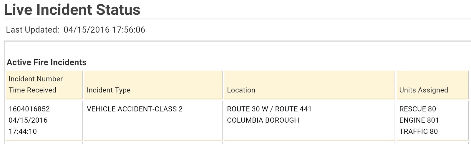 Emergency and law enforcement personnel responded to a two-vehicle accident at the Route 30 West off-ramp at Route 441 on Friday afternoon, April 15. No injuries were reported, but one driver had a suspended license and was found to be in possession of marijuana and drug paraphernalia. Charges are pending the outcome of lab testing.