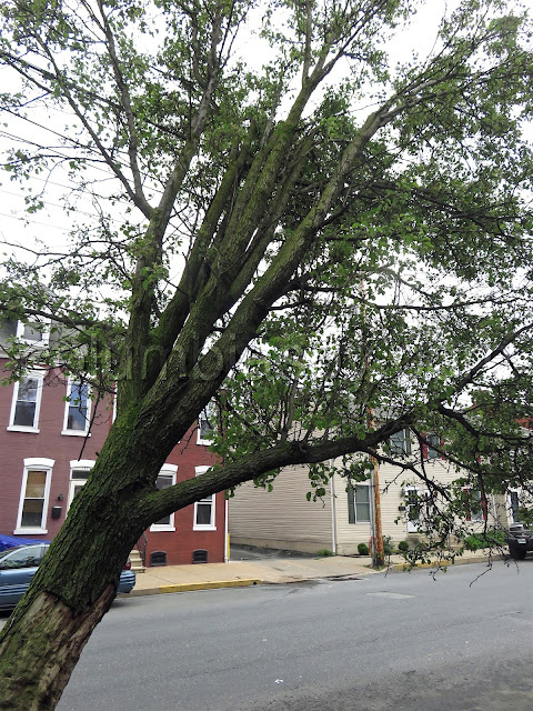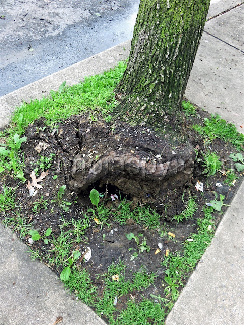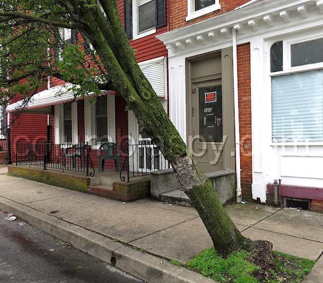 As Columbia Spy reported several weeks ago HERE (near the bottom of the page), a Bradford Pear tree in front of 150 South Fourth Street is falling over and is restrained only by utility wires over the sidewalk. Recent heavy rains and winds during the past week have contributed to the tree’s demise, and the tree is now leaning even further and has become a public safety concern. The base of the tree has lifted out of the root basin due to the high, weak root system of the Bradford Pear tree and the borough’s undersized root basins.