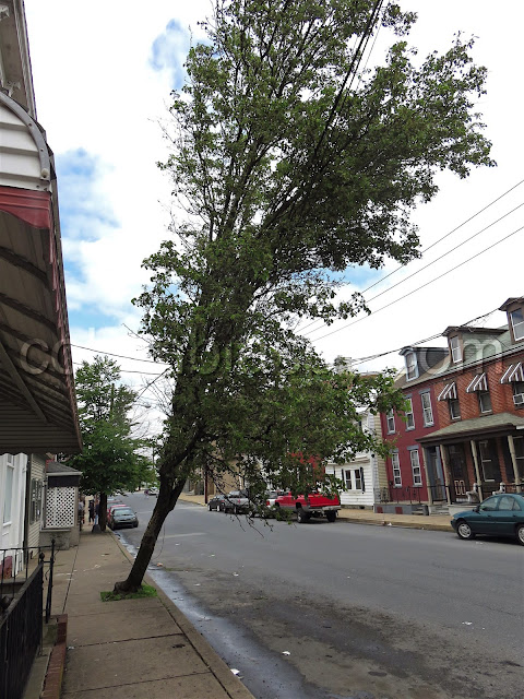 As Columbia Spy reported several weeks ago HERE (near the bottom of the page), a Bradford Pear tree in front of 150 South Fourth Street is falling over and is restrained only by utility wires over the sidewalk. Recent heavy rains and winds during the past week have contributed to the tree’s demise, and the tree is now leaning even further and has become a public safety concern. The base of the tree has lifted out of the root basin due to the high, weak root system of the Bradford Pear tree and the borough’s undersized root basins.