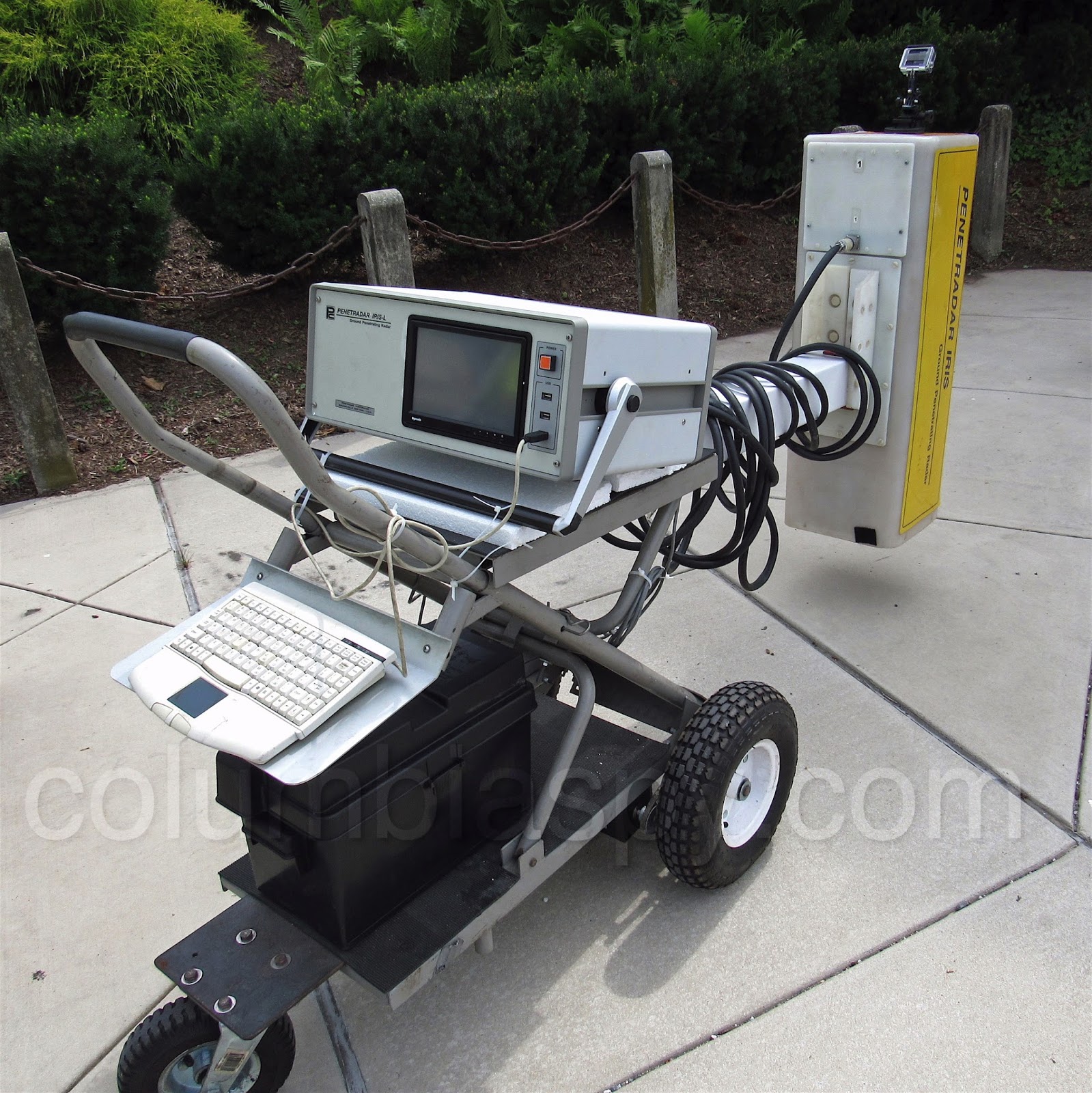 A portable radar unit used to scan the bridge sidewalk.