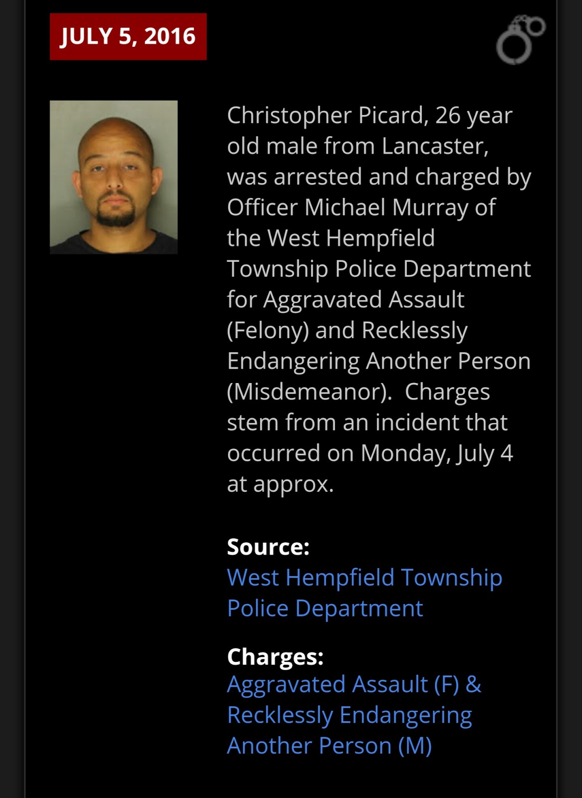 Christopher Picard, 26, was arrested and charged by West Hempfield Township Police for Aggravated Assault (Felony) and Recklessly Endangering Another Person (Misdemeanor). Charges stem from an incident that occurred on Monday, July 4 at approx. 8:50 am in the area of the 100 block of Stonehouse Lane. He was allegedly involved in a child custody dispute when the mother of their 3-year-old child attempted to remove the child from its car seat. As the she was doing so, Picard started to drive away, and the mother’s arm became stuck in the seatbelt, causing her to be dragged by Picard’s pick-up truck.