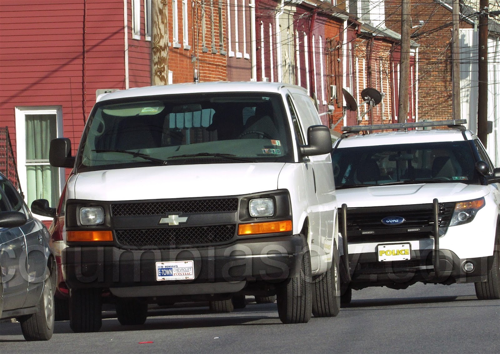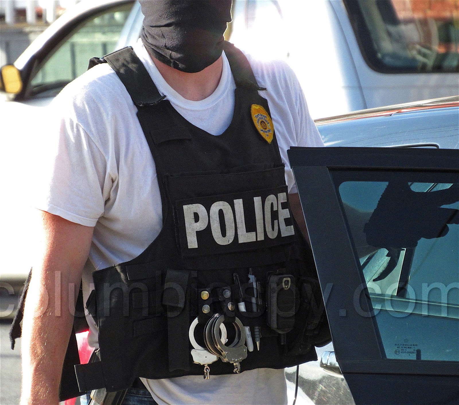 Undercover detectives from the Lancaster County Drug Task Force, along with Columbia Borough Police, apprehended a man at 313 North Second Street shortly after 6 p.m. today. According to witnesses, detectives tore their way through two screen windows on a front porch to enter the house. As police led the man to a police van, he shouted that the incident was due to a probation violation. A detective and bystanders engaged in a minor verbal altercation as police entered their vehicles to leave the scene.