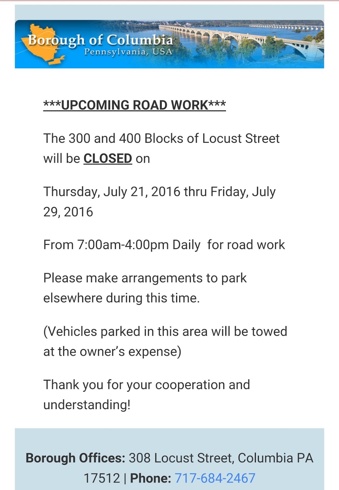 0 thoughts on “300 & 400 Blocks of Locust to be closed July 21-29, 7 am to 4 pm”