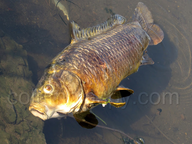 About a year ago there was a large pile of dead carp along the side of Malleable Road. I could not figure out what was going on, so I took a picture. I dug it out after seeing this article and sure enough there are I obvious wounds on the carp in my photo. Catch and release doesn't work with bow-fishing, that looks like catch to kill and don't even eat them.