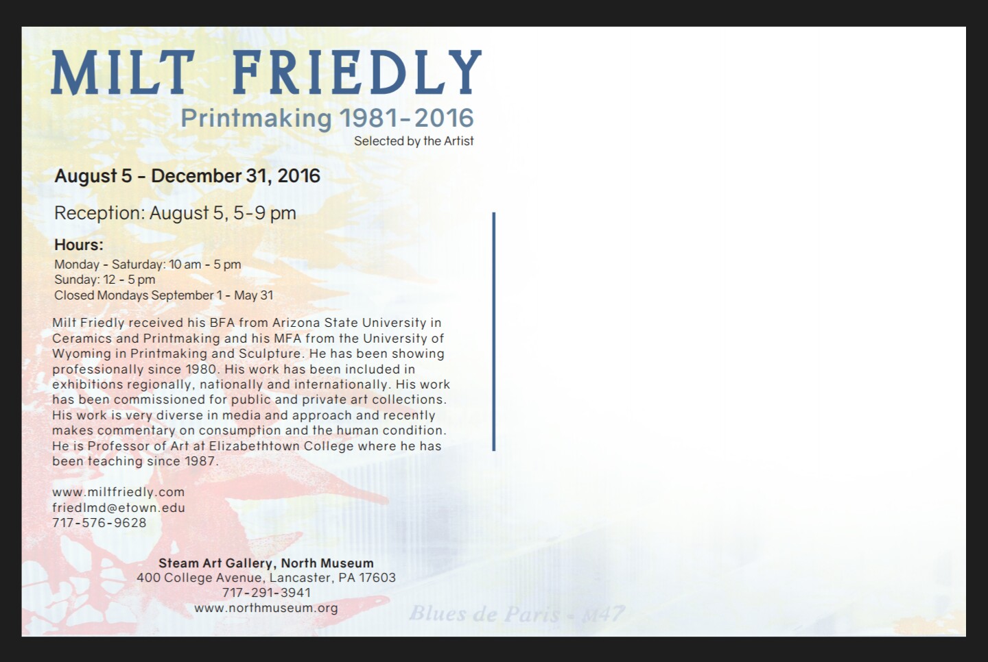 Milt Friedly, Co-Owner, Curator and Director of the Susquehanna Center for the Creative Arts will show his Printmaking at the North Museum, Lancaster, PA.