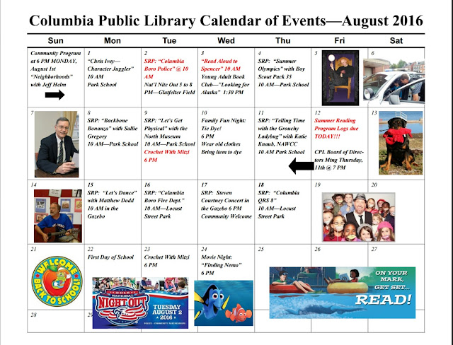 Columbia Public Library Calendar of Events – August 2016 Share this: Share on X (Opens in new window) X Share on Facebook (Opens in new window) Facebook More Share on Bluesky (Opens in new window) Bluesky Share on X (Opens in new window) X Like Loading... Related