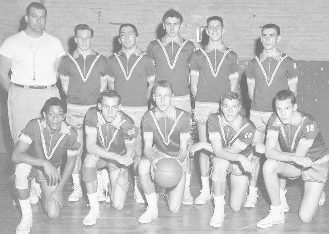 (Team members pictured are front row:: Albert Stanton, Elwood Pickell, John Betrone (Captain) Jerry Raifsnider and Steve Wisler. Back row, Coach Elmer Kreiser, Earl “Nook” Shive, Cliff Fox, Don Aston, Don Murray and Gordon Eck Sr.)