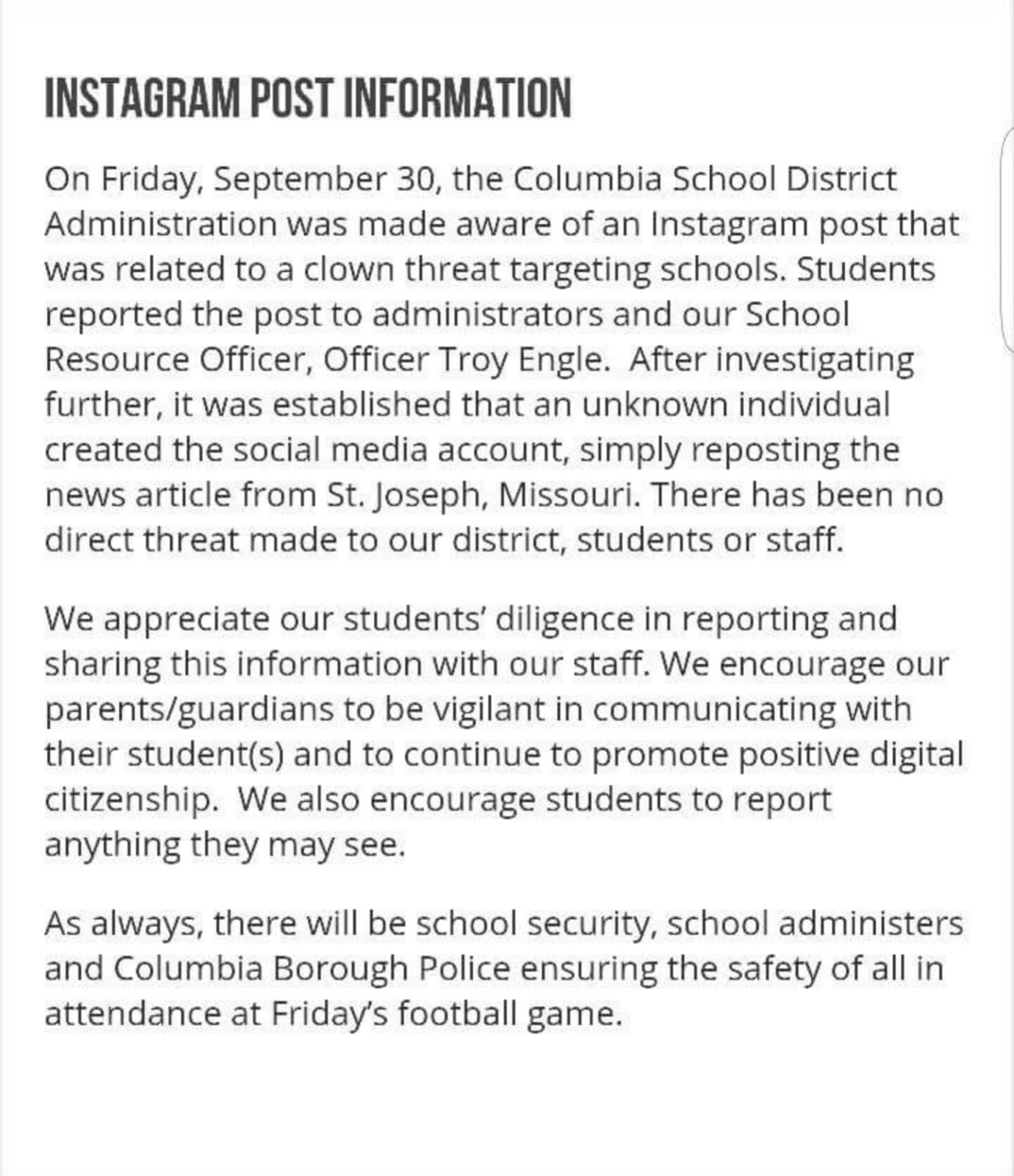 Shown below is a notice from Columbia Borough School District regarding a supposed “clown threat” to Columbia schools. The district also notified residents via an automated phone call. The threat was found to be bogus.