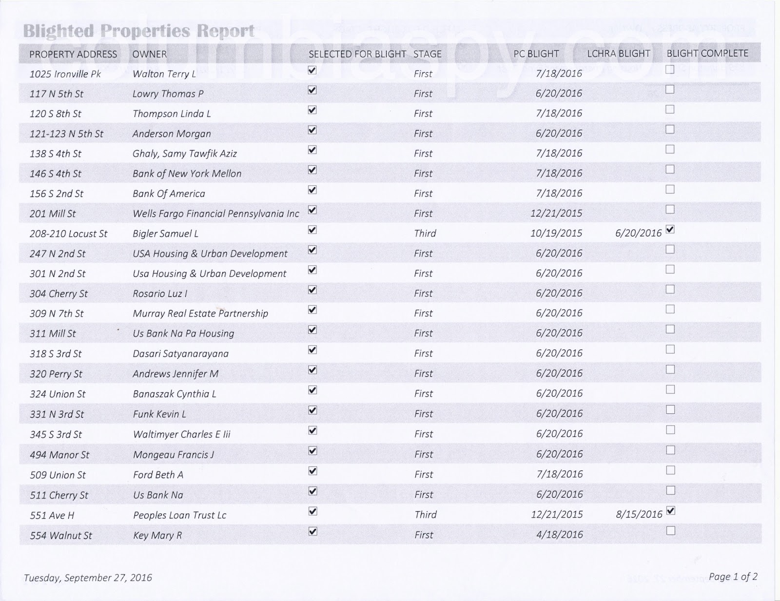 Columbia Borough Blighted Properties Report The following Columbia Borough properties are determined to be in various stages of blight. Owners and stages of blight are shown below: Share this: Click to share on X (Opens in new window) X Click to share on Facebook (Opens in new window) Facebook More Click to share on Bluesky (Opens in new window) Bluesky Click to share on X (Opens in new window) X Like Loading... Related