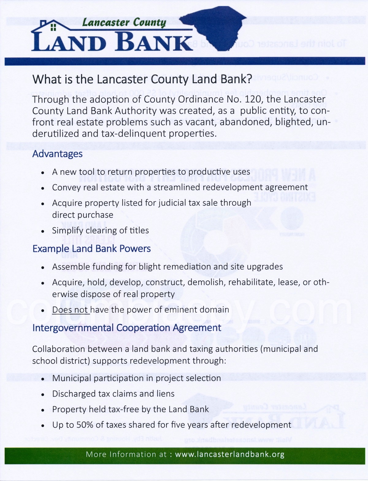 1. This Land Bank thing sounds like another level of tax-payer funded bureaucracy !, put together by a bunch of people that want to better secure their own jobs and further justify their own existence. Columbia can control it's own destiny by simply ramping up Code Enforcement.Turning these properties over to a Land Bank will take the properties off the tax rolls while the friends of the higher ups get contracts to waste more tax payer money on the properties ! Columbia will make out better if we just use our existing Code Laws, and FINE the heck out of the owners of our own blighted properties ! When the owners can't pay the fines, or can't pay the Real Estate taxes, place the mechanics liens and force the sale of the properties ! That KEEPS the properties ON the tax rolls and forces the properties to sell in to new private hands using new private money, rather then wasting our tax dollars funding another level of Bureaucracy ! Don't do it Columbia ! Let the rest of the County play that game, but not us, Please !!